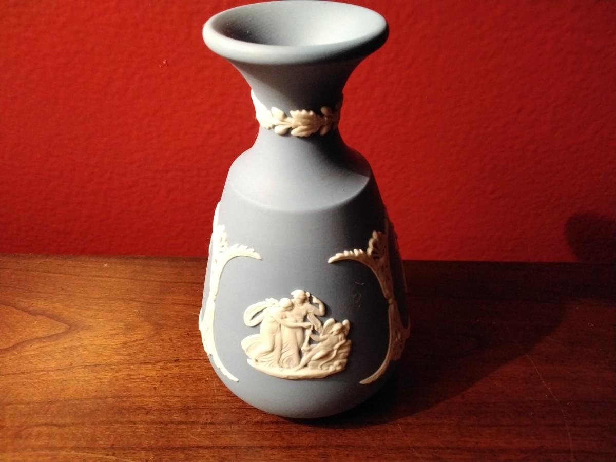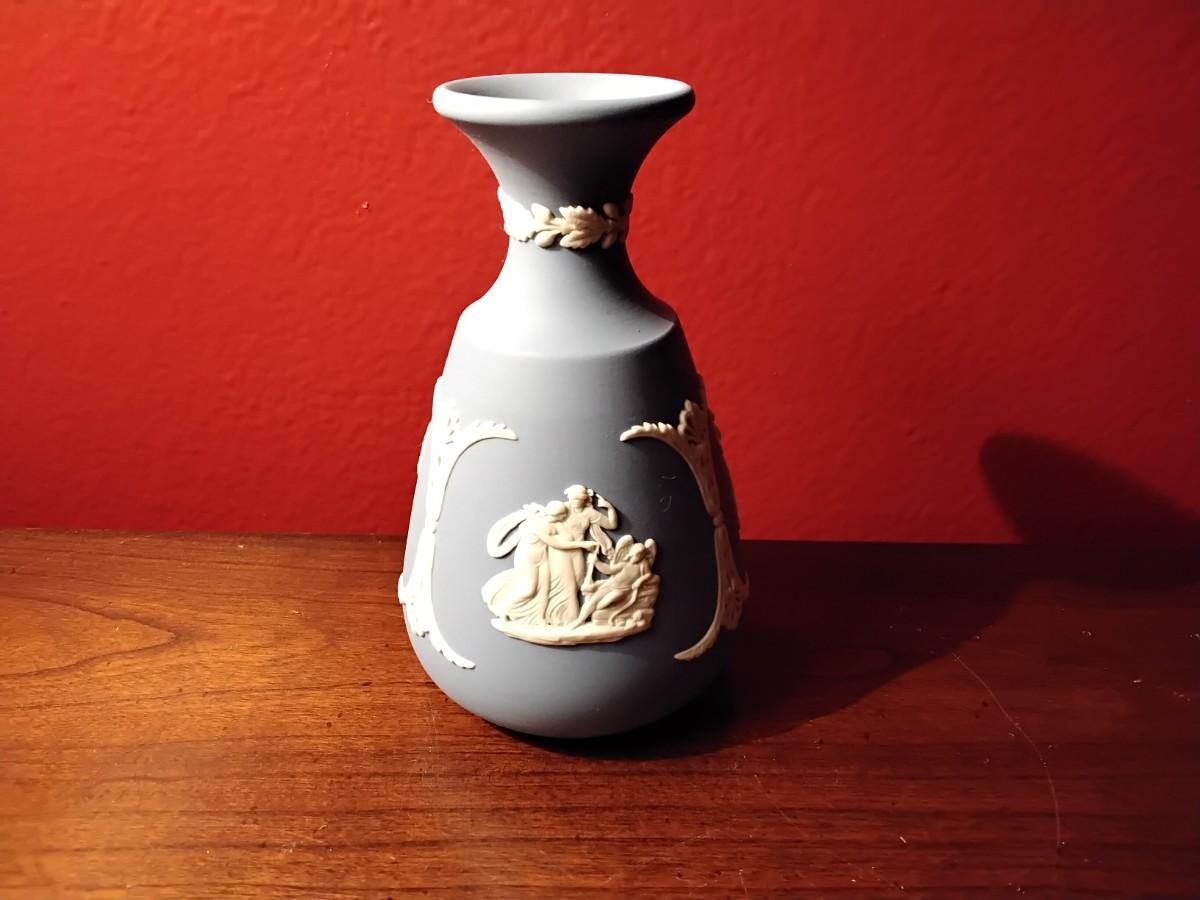 Beautiful vintage Wedgwood, jasperware bud vase with 3 cameo scenes and beautiful white relief work in between each scene, as well as relief work on the the neck of the vase. Stamped Wedgwood, Made in England, 67. Stands 5" high. A real beauty! Height 4.75"