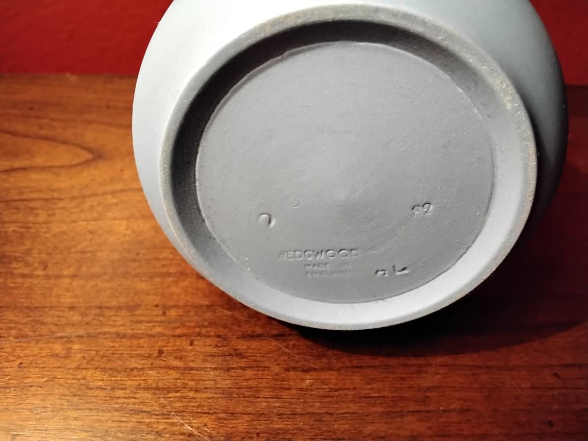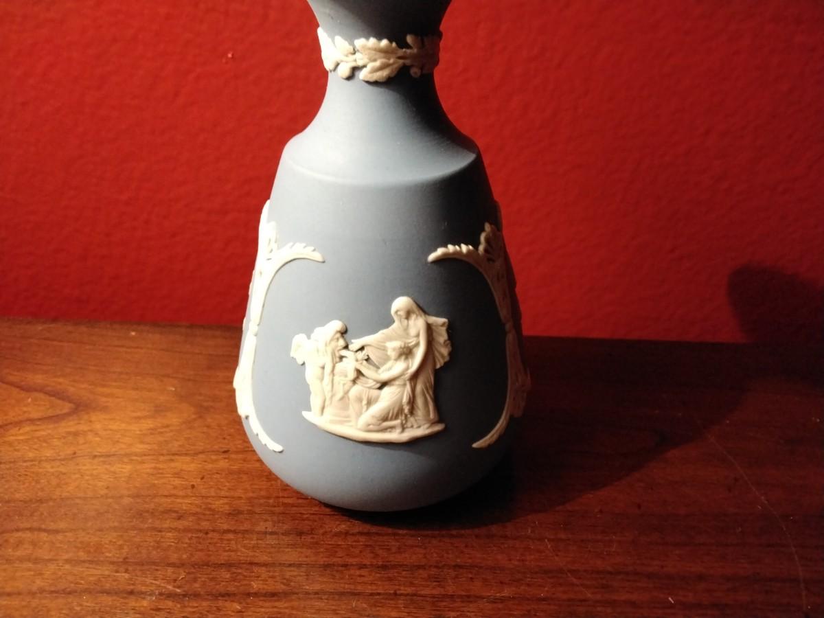 Beautiful vintage Wedgwood, jasperware bud vase with 3 cameo scenes and beautiful white relief work in between each scene, as well as relief work on the the neck of the vase. Stamped Wedgwood, Made in England, 67. Stands 5" high. A real beauty! Height 4.75"