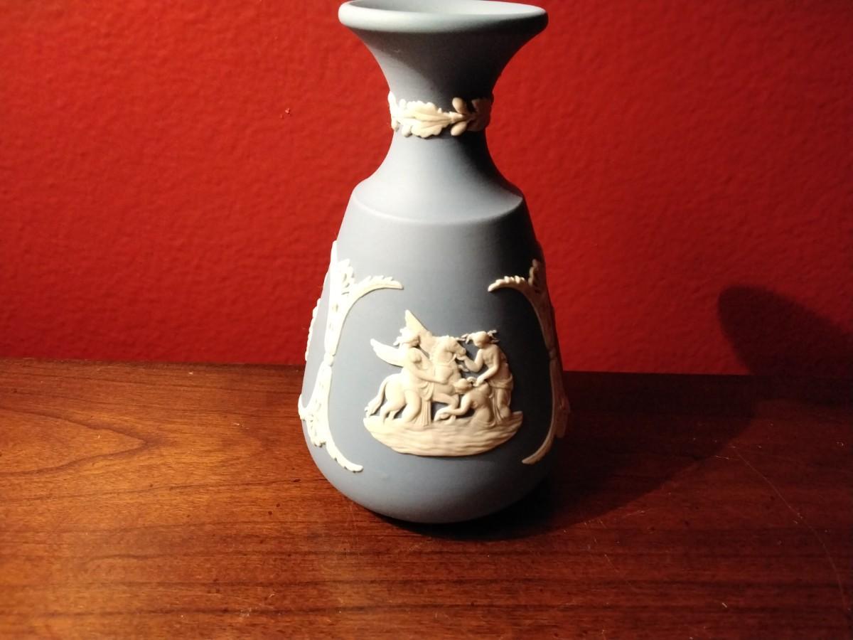 Beautiful vintage Wedgwood, jasperware bud vase with 3 cameo scenes and beautiful white relief work in between each scene, as well as relief work on the the neck of the vase. Stamped Wedgwood, Made in England, 67. Stands 5" high. A real beauty! Height 4.75"