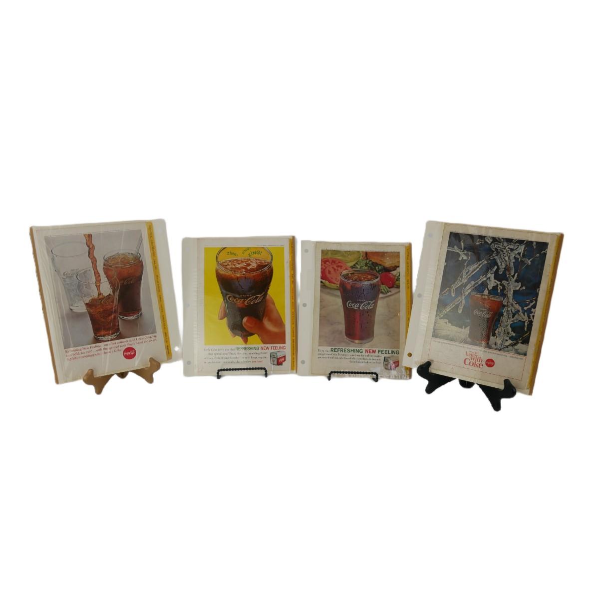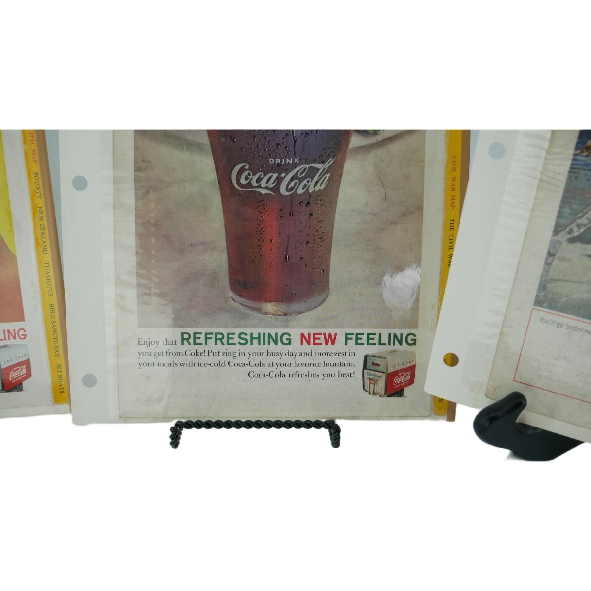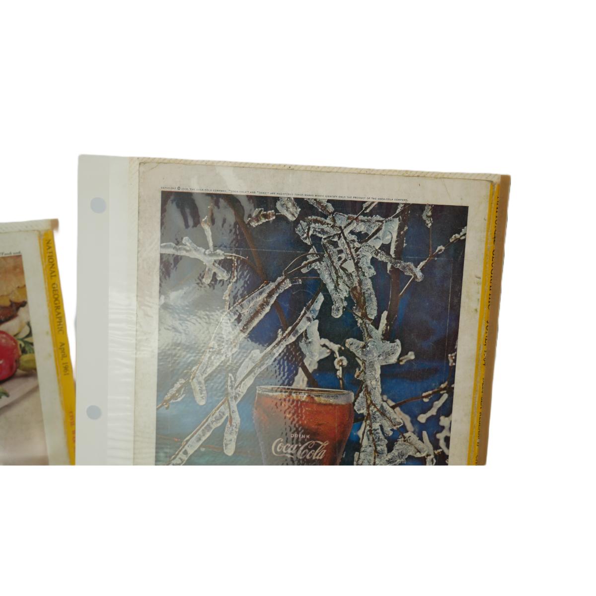 Five vintage Coca-Cola advertisements. Dated April 1961, July 1961, April 1962, June 1963, and June 1964. Taken from The National Geogrpahic Magazine and kept in these loose scrapbook sheets. Varying condition, overall good shape for their age. Each magazine advertisement measures approximately L 7" x H 10". Lot weighs 4 oz. (C86)