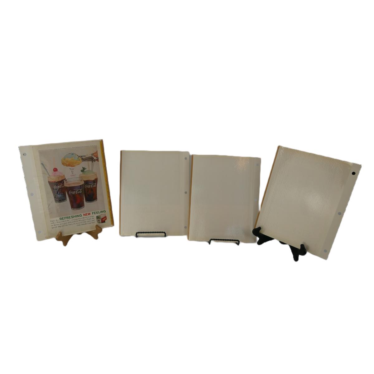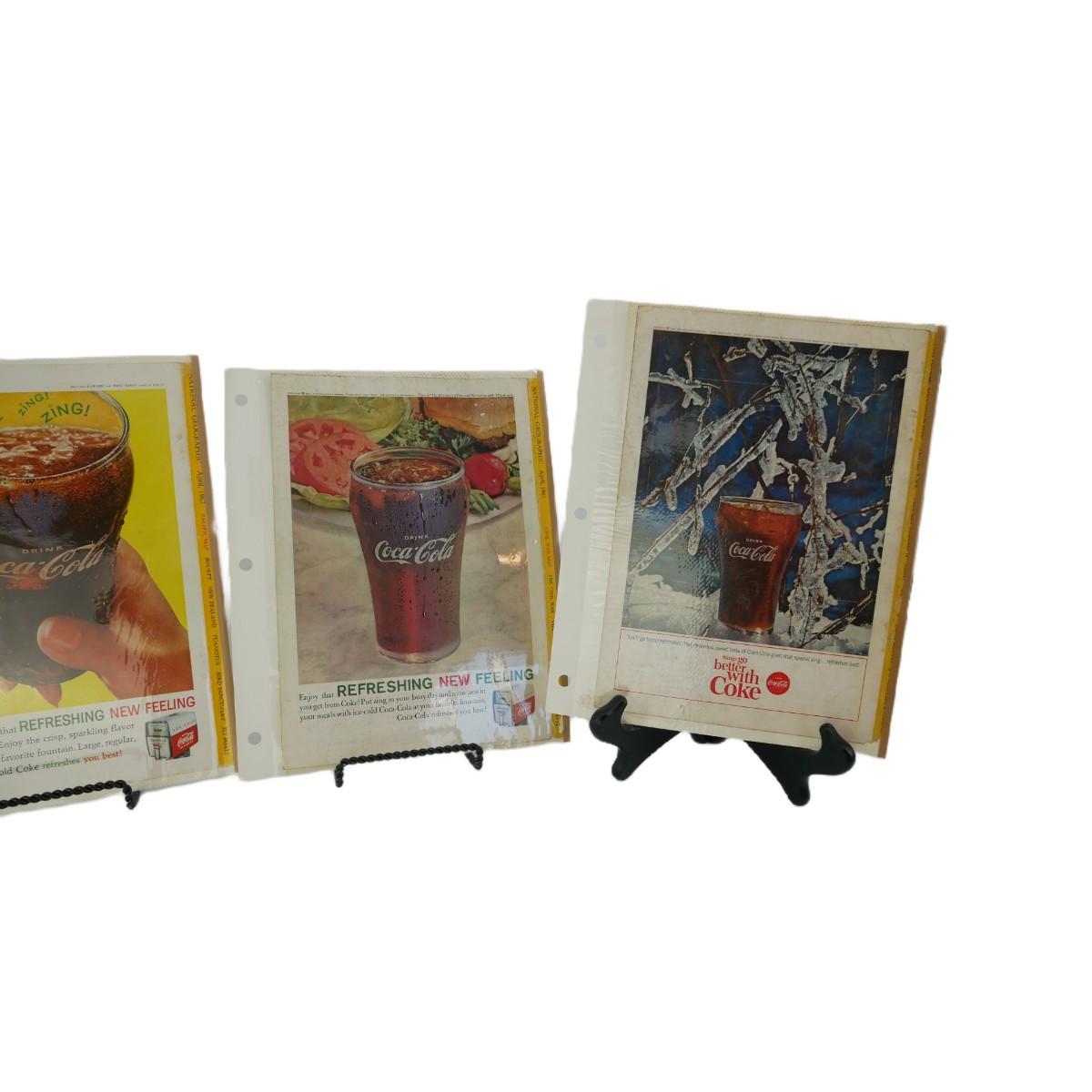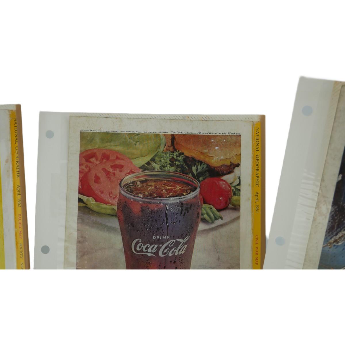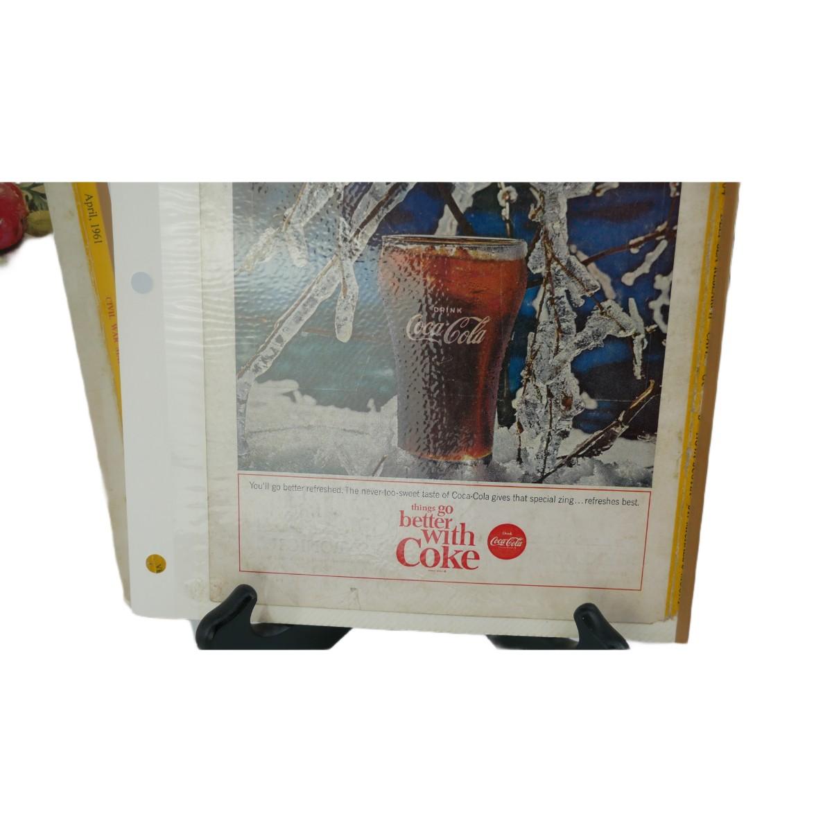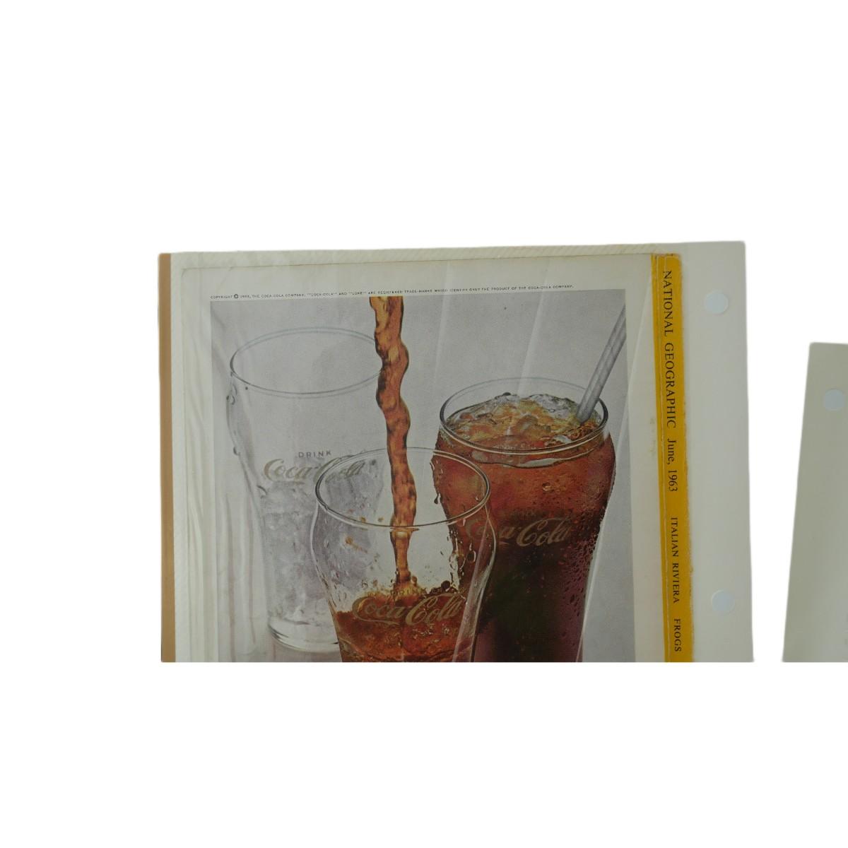 Five vintage Coca-Cola advertisements. Dated April 1961, July 1961, April 1962, June 1963, and June 1964. Taken from The National Geogrpahic Magazine and kept in these loose scrapbook sheets. Varying condition, overall good shape for their age. Each magazine advertisement measures approximately L 7" x H 10". Lot weighs 4 oz. (C86)