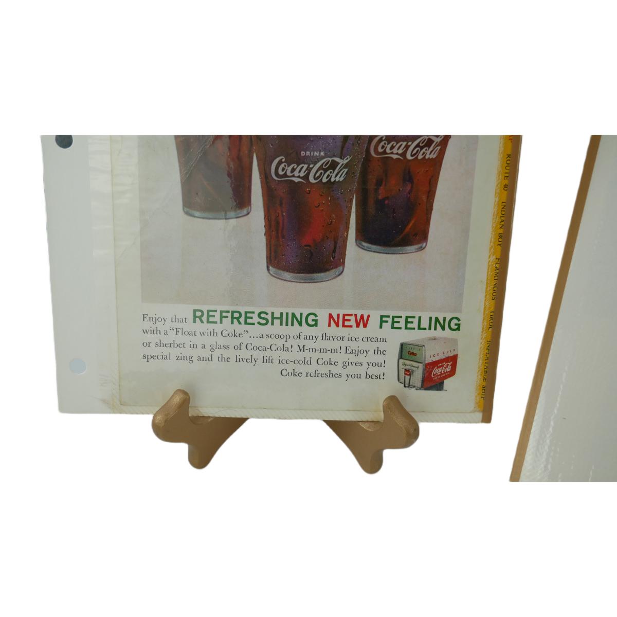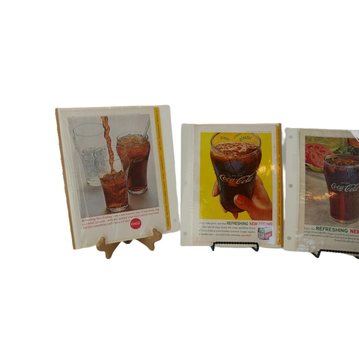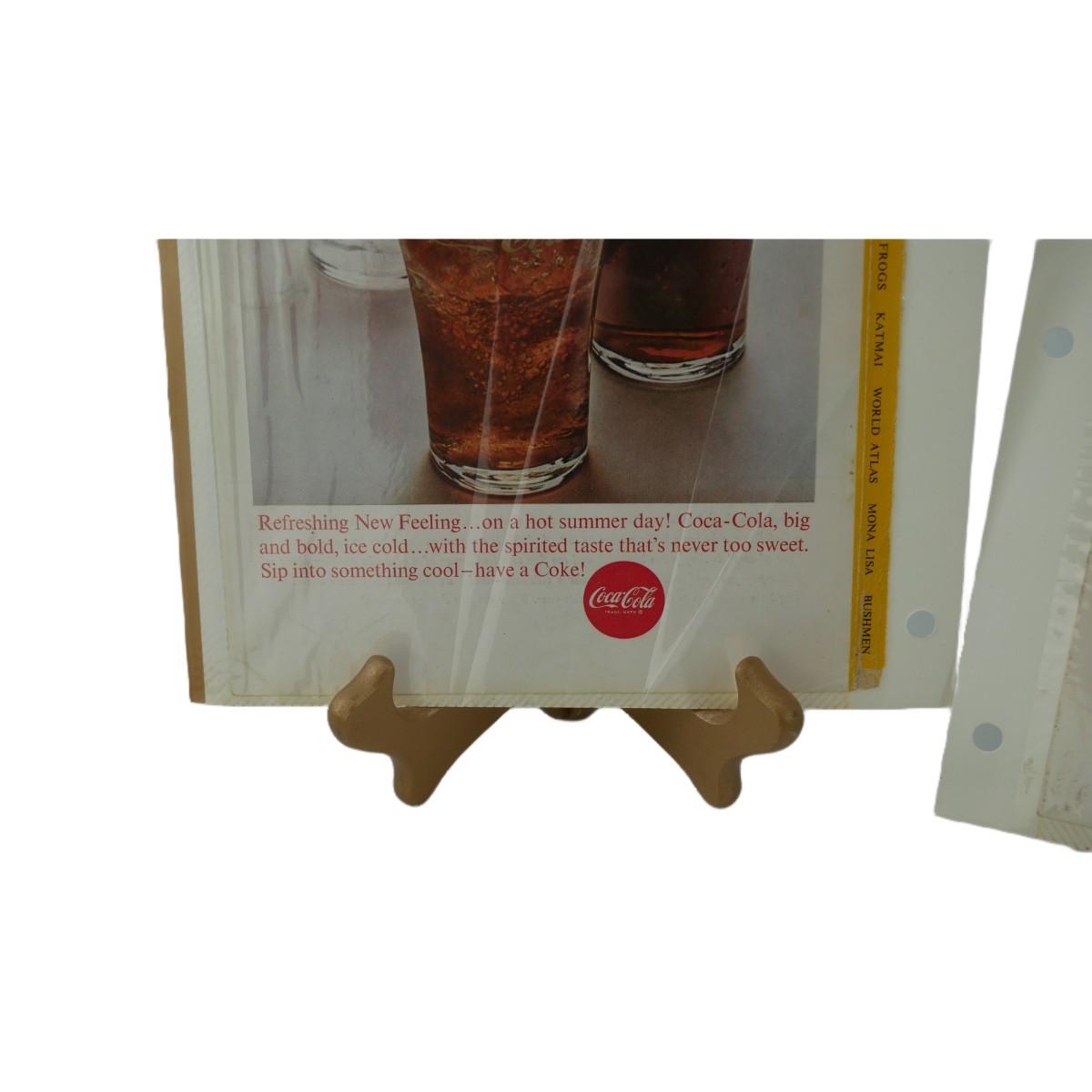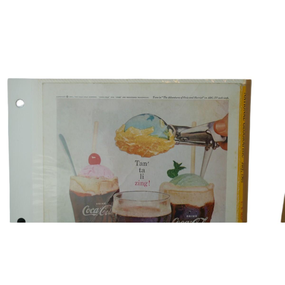 Five vintage Coca-Cola advertisements. Dated April 1961, July 1961, April 1962, June 1963, and June 1964. Taken from The National Geogrpahic Magazine and kept in these loose scrapbook sheets. Varying condition, overall good shape for their age. Each magazine advertisement measures approximately L 7" x H 10". Lot weighs 4 oz. (C86)
