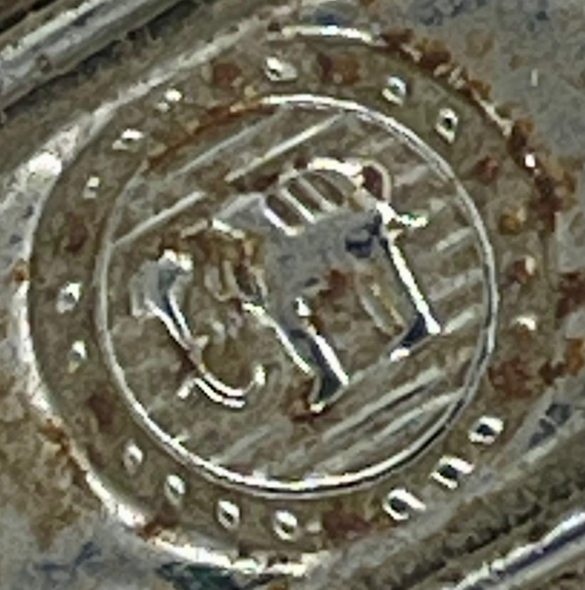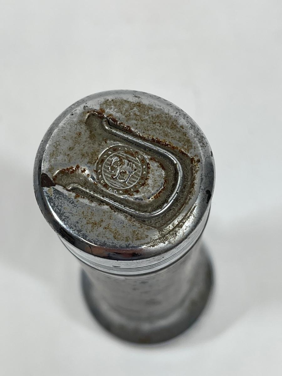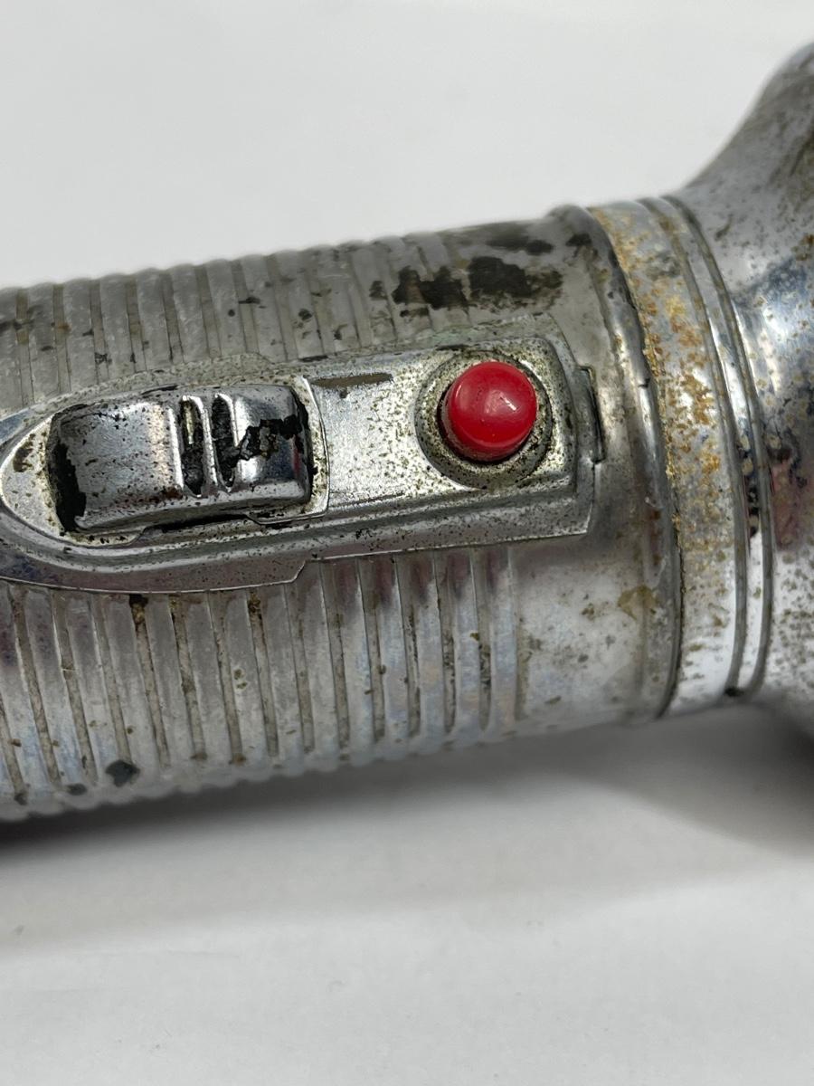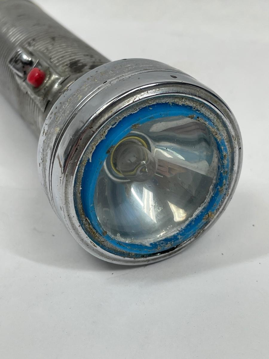 Has lots of corrosion, but can likely be cleaned up. Switch slides easily, lens cover is in good condition. Still contains batteries, end cap is stuck. Unable to identify logo, might be White Elephant.