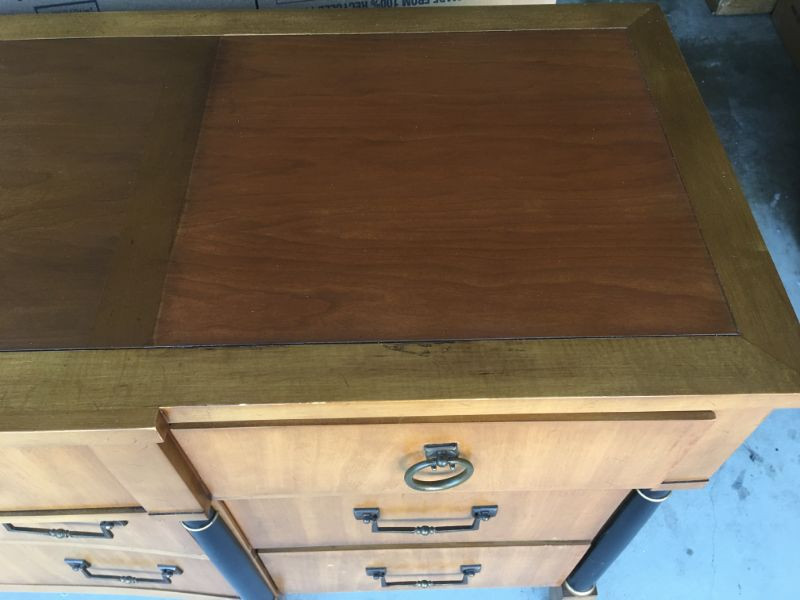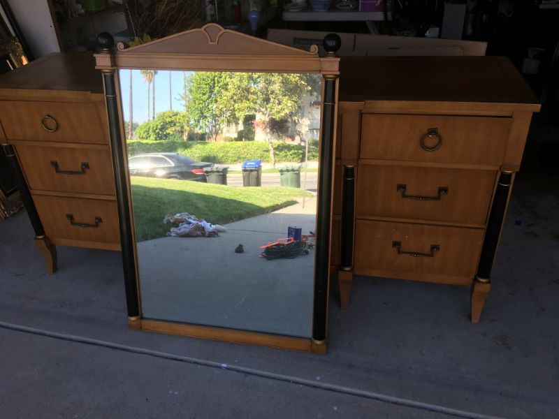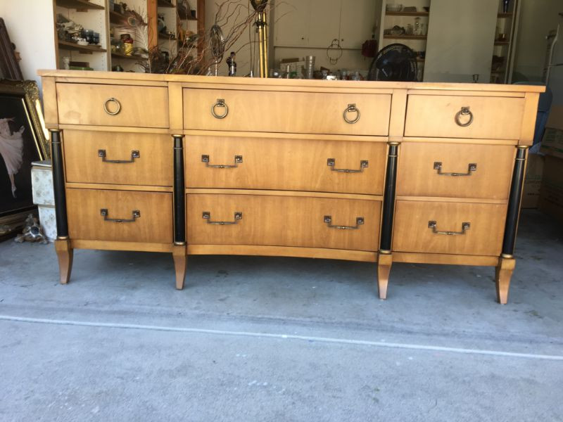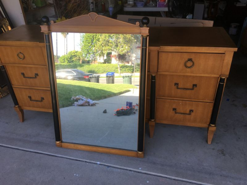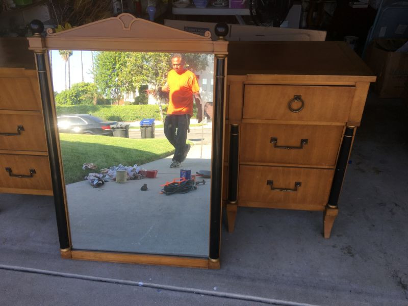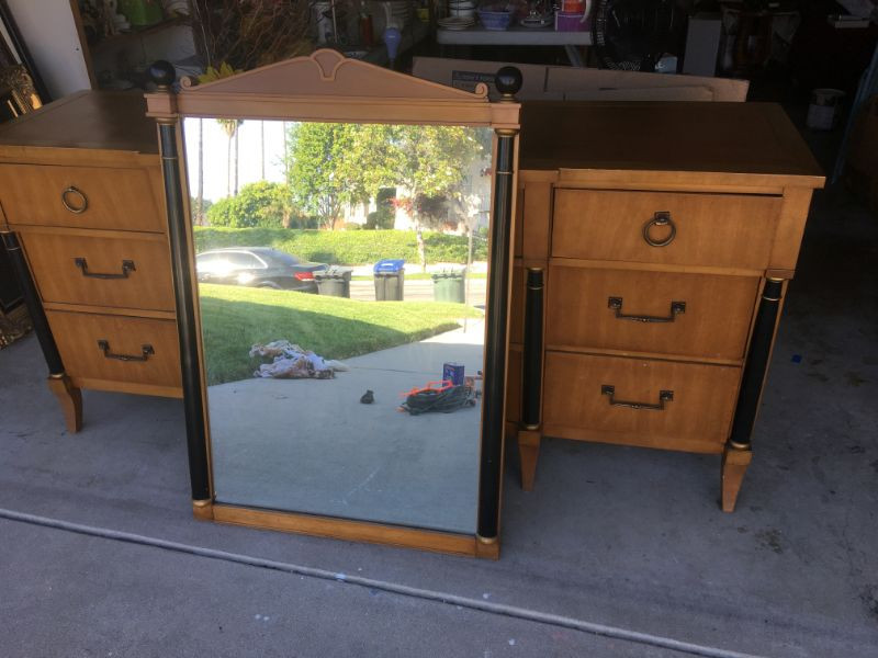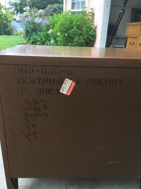 FOR SALE A PAIR OF SIDE STANDS AND A CREDENZA WITH MIRROR, EGYPTIAN REVIVAL STYLE, KNOWN AS WESTPHALIA CHEERY MADE IN 1961. VERY RARE SET, I WASN'T ABLE TO FIND A SIMILAR DESIGN IN THE DREXEL CATALOGUES. IN VERY GOOD- CONDITIONS, STAMPS ON THE BACK WITH THE MARK AND 12/61 THE FABRICATION DATE. FEW SCRATCHES NORMAL FOR THEIR AGE, A VERY WANTED STYLE. THIS IS A FULL SET WITH CREDENZA, MIRROR AND TWO SIDE STANDS. TOTAL OF 4 PIECES. THE DRESSER/CREDENZA NEEDS WORK ON THE 3RD OR THE LAST TOP PART FROM THE RIGHT. SOMEONE STARTED TO REFINISH THIS AND THE COLOR CAME TO BE MORE REDDISH. (see 2nd photo). I AM SELLING IT "AS IS" . SINCE WE DO BUYOUTS, WE CAN SELL THE FULL SET FOR LESS THAN HALF OF THE RETAIL VALUE BUT IT NEEDS TO BE FINISHED. ALSO, THE RIGHT TOP DRAWER IN MISSING PART OF THE KNOB. MEASUREMENTS; CREDENZA - 71" WIDTH X 20" DEPTH X 33" HEIGHT. SIDE STANDS: 24"X 16" X 24" AND MIRROR 42" X 29.5". I MIGHT BE WRONG WITHIN PLUS MINUS HALF INCH. PRICED ACCORDINGLY. This item has a reserve.
