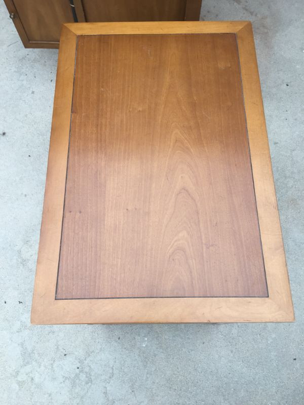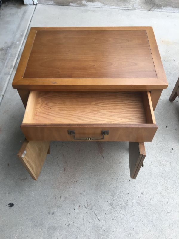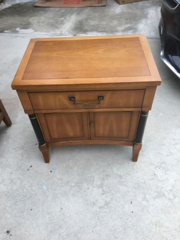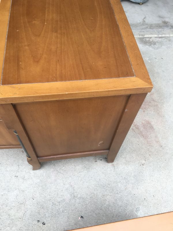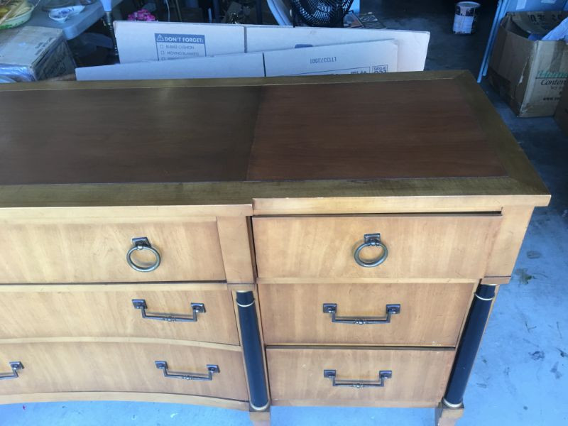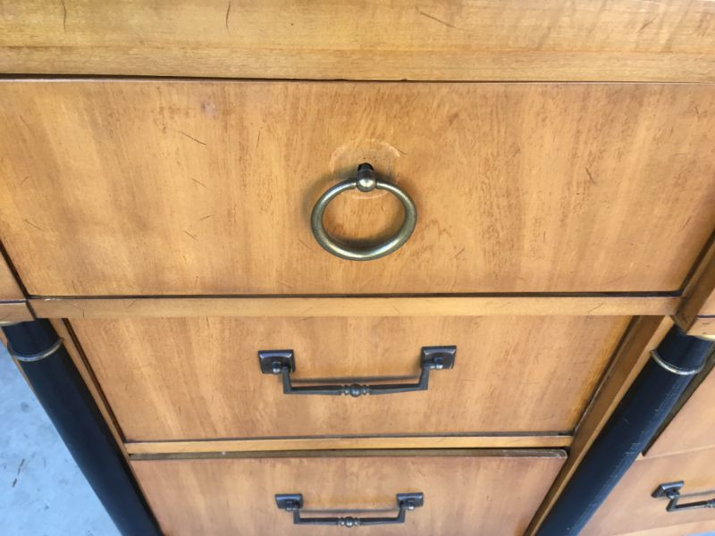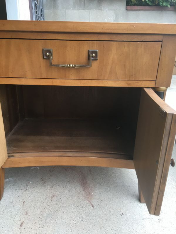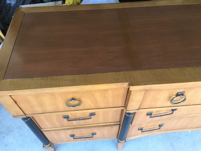 FOR SALE A PAIR OF SIDE STANDS AND A CREDENZA WITH MIRROR, EGYPTIAN REVIVAL STYLE, KNOWN AS WESTPHALIA CHEERY MADE IN 1961. VERY RARE SET, I WASN'T ABLE TO FIND A SIMILAR DESIGN IN THE DREXEL CATALOGUES. IN VERY GOOD- CONDITIONS, STAMPS ON THE BACK WITH THE MARK AND 12/61 THE FABRICATION DATE. FEW SCRATCHES NORMAL FOR THEIR AGE, A VERY WANTED STYLE. THIS IS A FULL SET WITH CREDENZA, MIRROR AND TWO SIDE STANDS. TOTAL OF 4 PIECES. THE DRESSER/CREDENZA NEEDS WORK ON THE 3RD OR THE LAST TOP PART FROM THE RIGHT. SOMEONE STARTED TO REFINISH THIS AND THE COLOR CAME TO BE MORE REDDISH. (see 2nd photo). I AM SELLING IT "AS IS" . SINCE WE DO BUYOUTS, WE CAN SELL THE FULL SET FOR LESS THAN HALF OF THE RETAIL VALUE BUT IT NEEDS TO BE FINISHED. ALSO, THE RIGHT TOP DRAWER IN MISSING PART OF THE KNOB. MEASUREMENTS; CREDENZA - 71" WIDTH X 20" DEPTH X 33" HEIGHT. SIDE STANDS: 24"X 16" X 24" AND MIRROR 42" X 29.5". I MIGHT BE WRONG WITHIN PLUS MINUS HALF INCH. PRICED ACCORDINGLY. This item has a reserve.