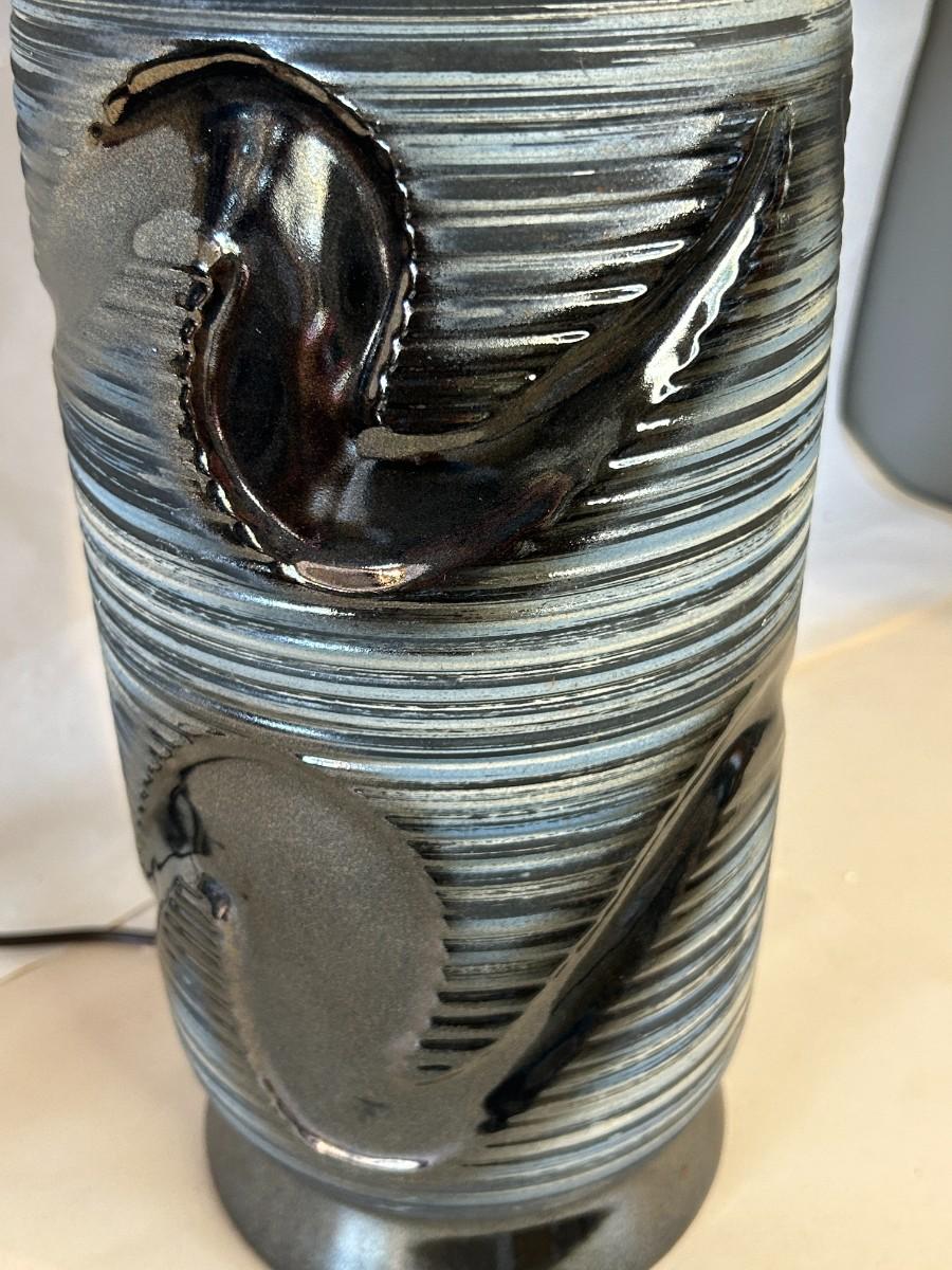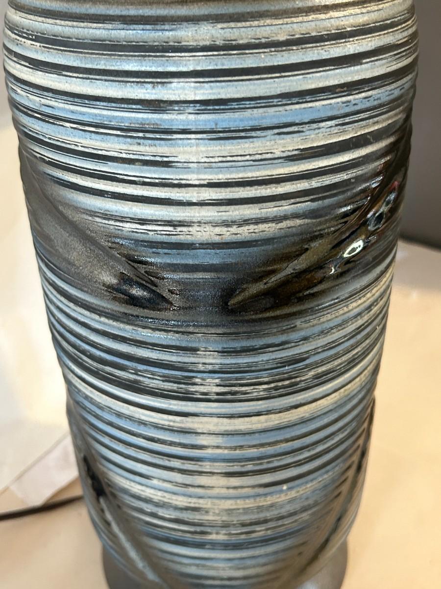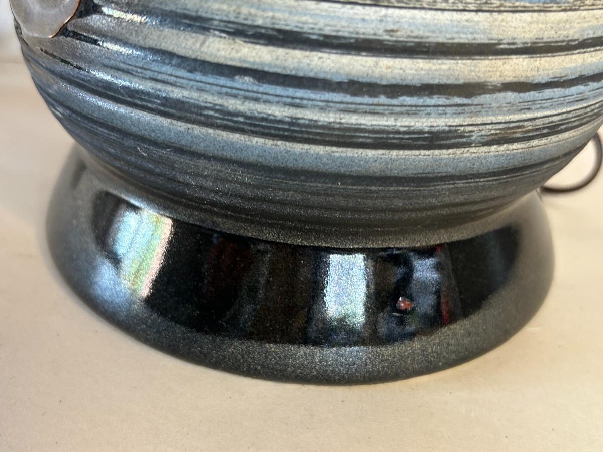 Blue Hues with a Black wave design on the front that carries to the back. Beautiful and flawless in person. Reflective Mirrored Detail at Top of the Lamp.