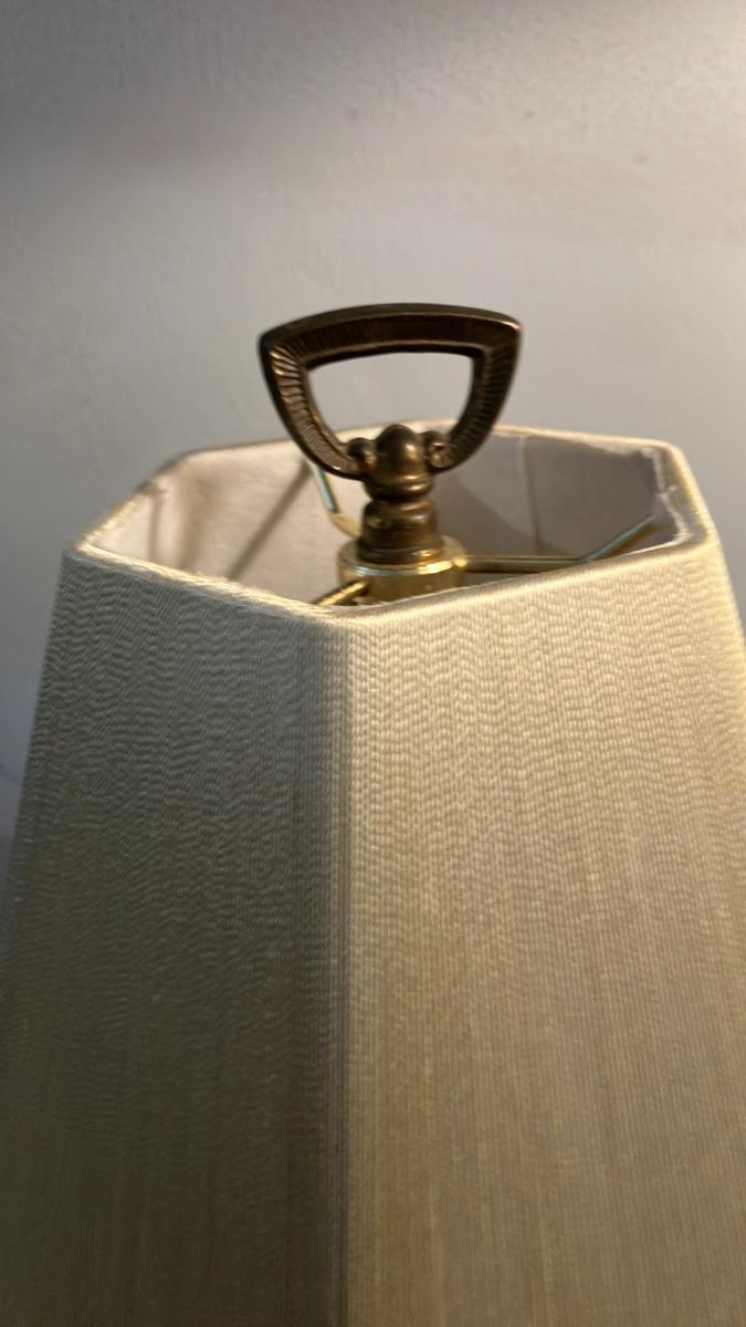 The lamp stands on an elaborate footed pedestal base and includes the original beige fabric shade (octagonal style), brass harp, and finial. It measures approximately [insert your measurements if known; based on photo, likely ~20–28" overall height]. The piece shows honest vintage wear consistent with age, including patina variation and minor surface oxidation. Currently not working (likely requires rewiring), but presents beautifully as a decorative accent or with simple restoration.