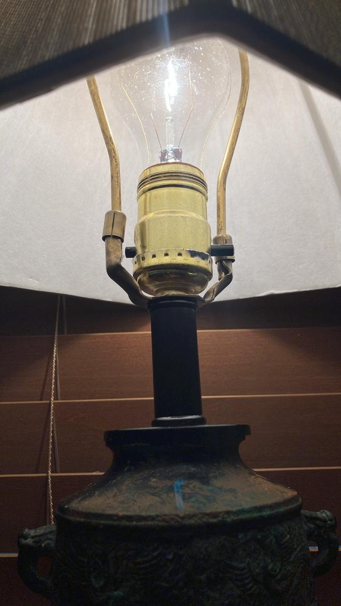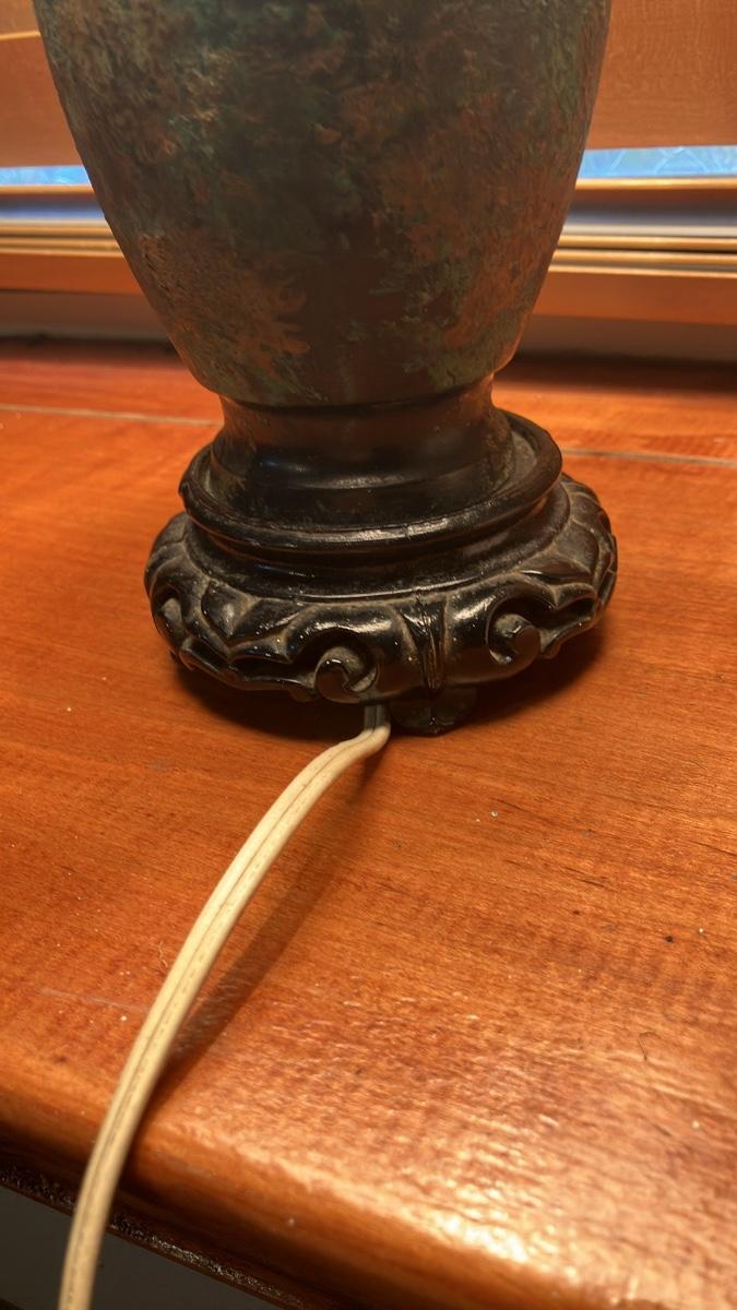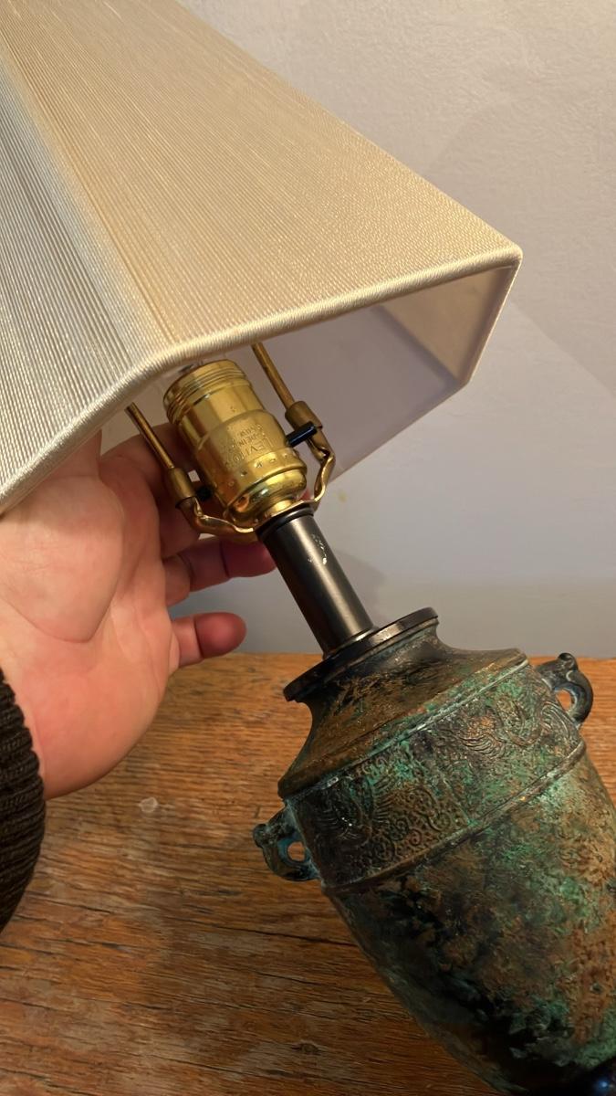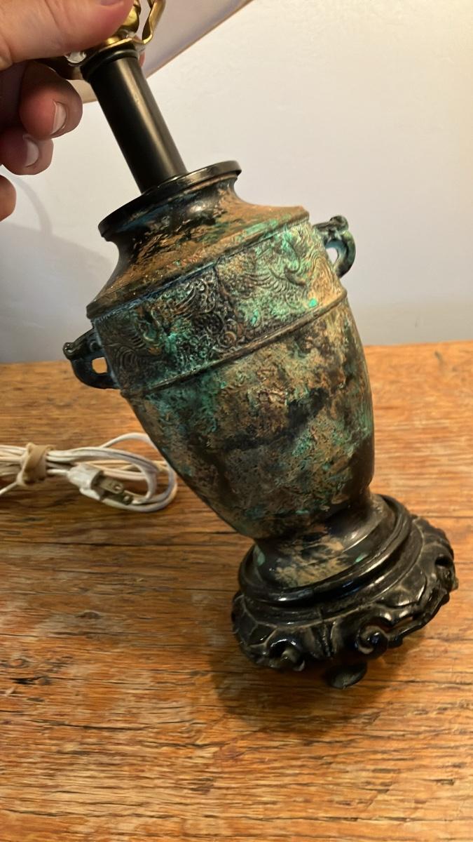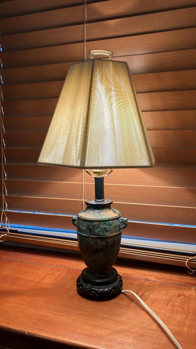 Vintage 1960s L&L Lamp Co. Asian Bronze Vessel Urn Table Lamp & Shade 20”h