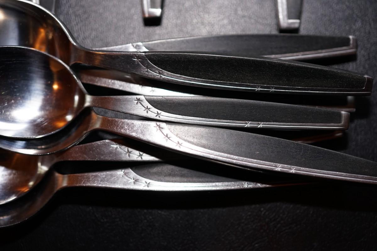 scratches on the tines of the forks from use, the spoons and knives are in good condition. minor surface scratches.