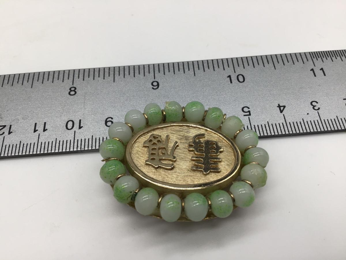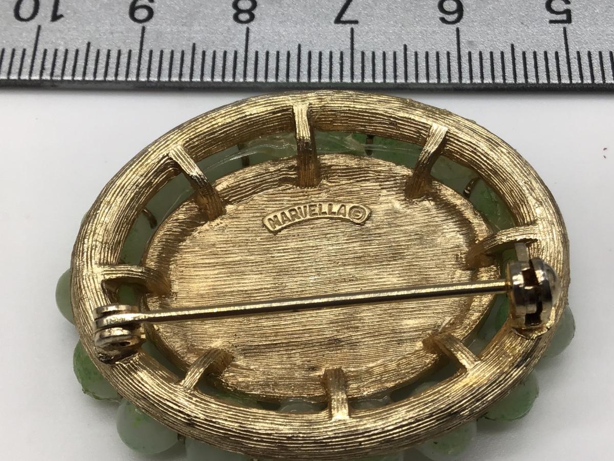 VINTAGE 1960'S Marvella ART GLASS JADE GOLD TONE ASIAN BROOCH