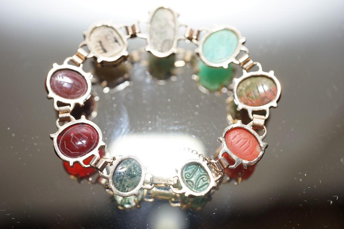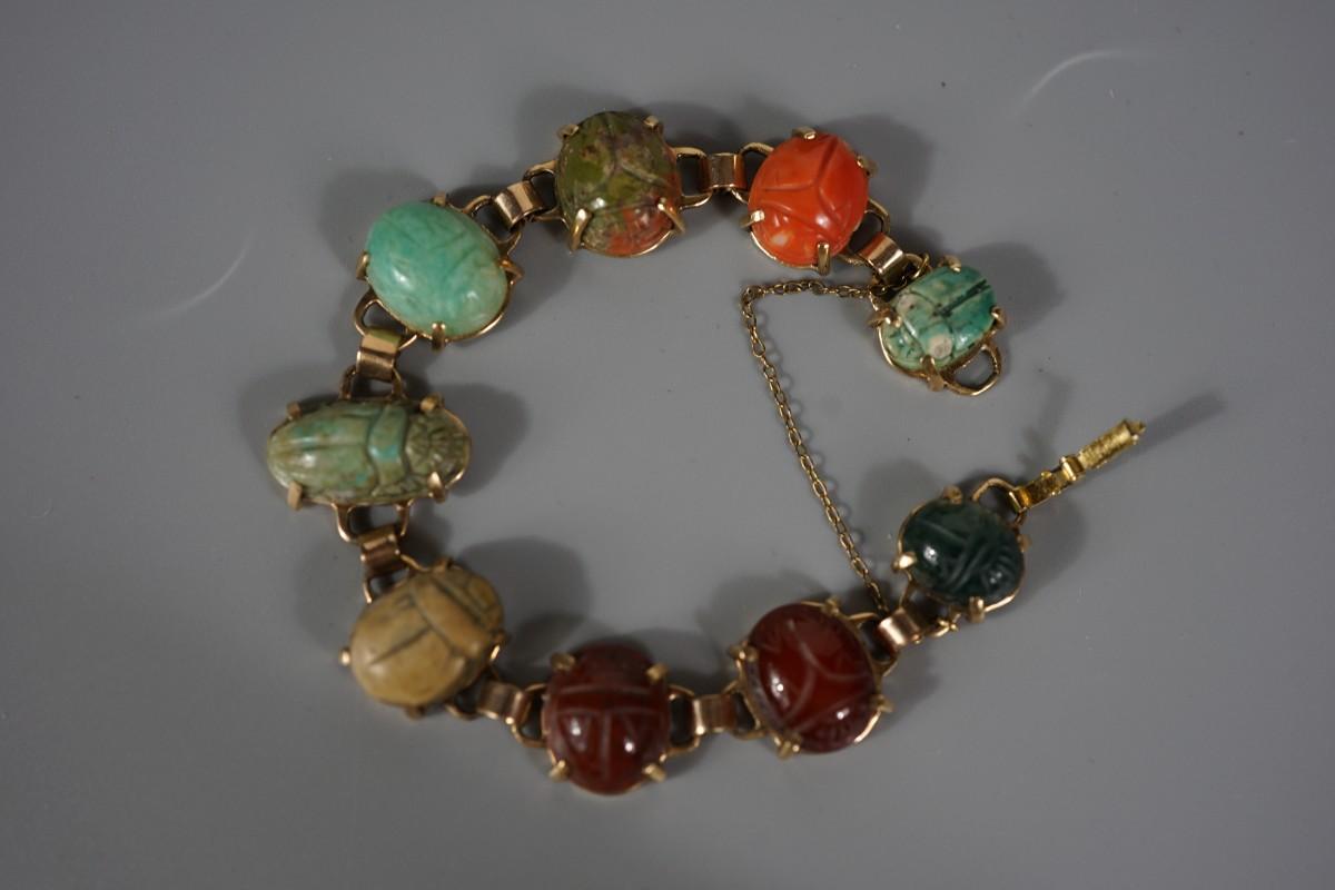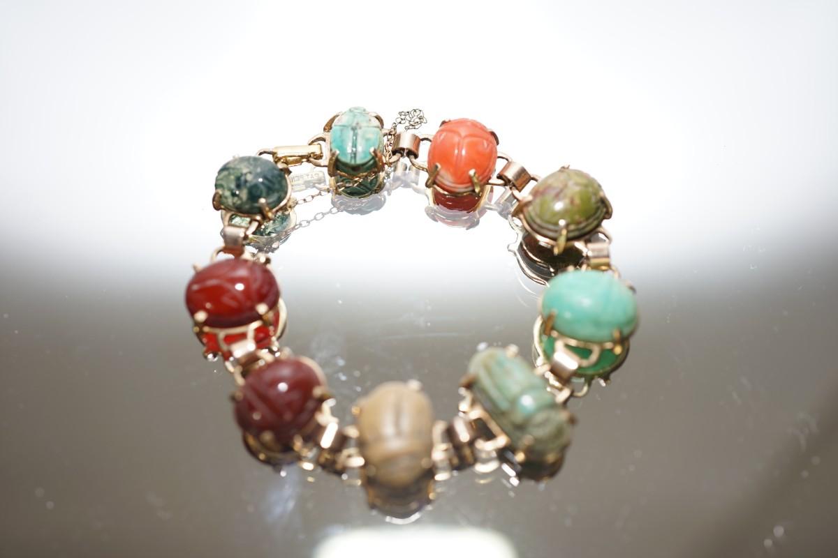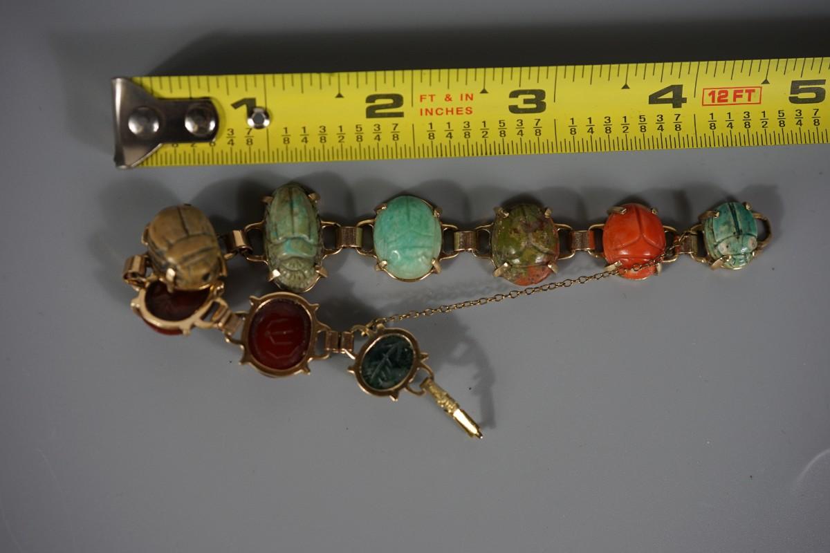 VINTAGE 1960'S SCARAB BRACELET GOLD FILLED / SEMI PRECIOUS CARVED STONES.