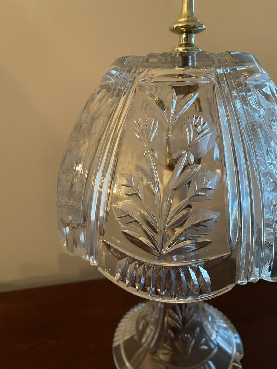Cottage, shabby chic, vintage, or Bohemian-style ready! Lovely, petite lamp in cut glass with scalloped shade. Brass finial & hardware. 14" H x 8" W at shade base. Excellent condition. # 1037