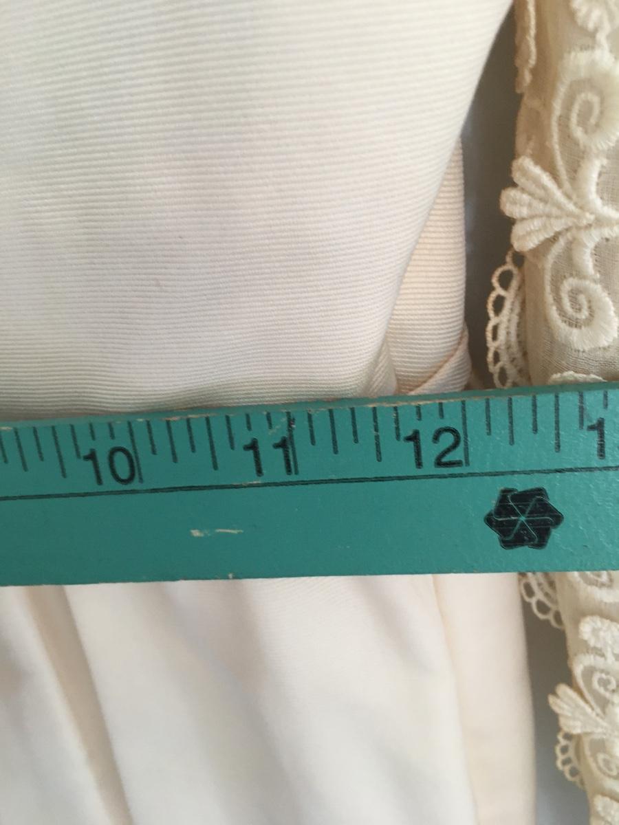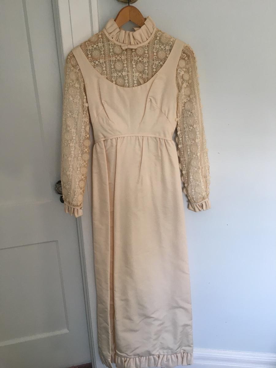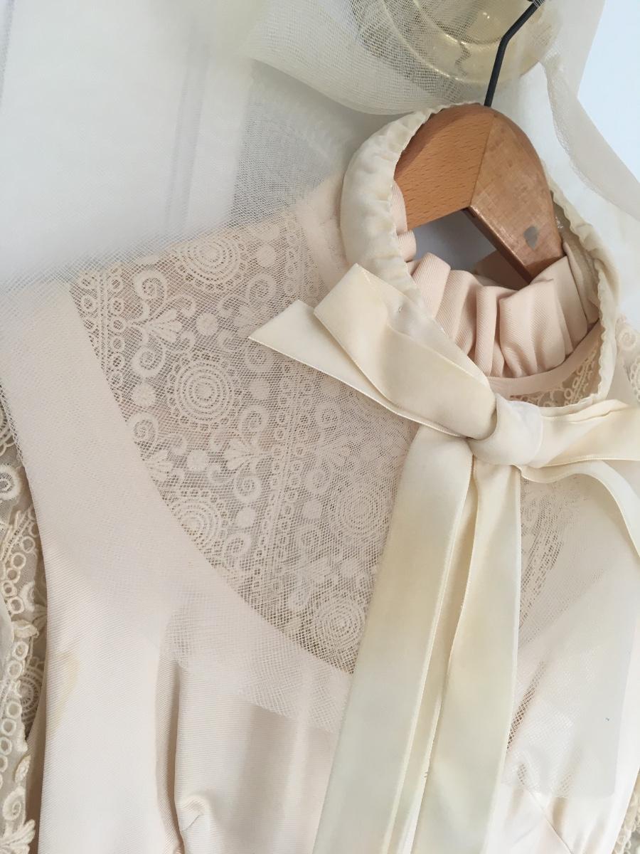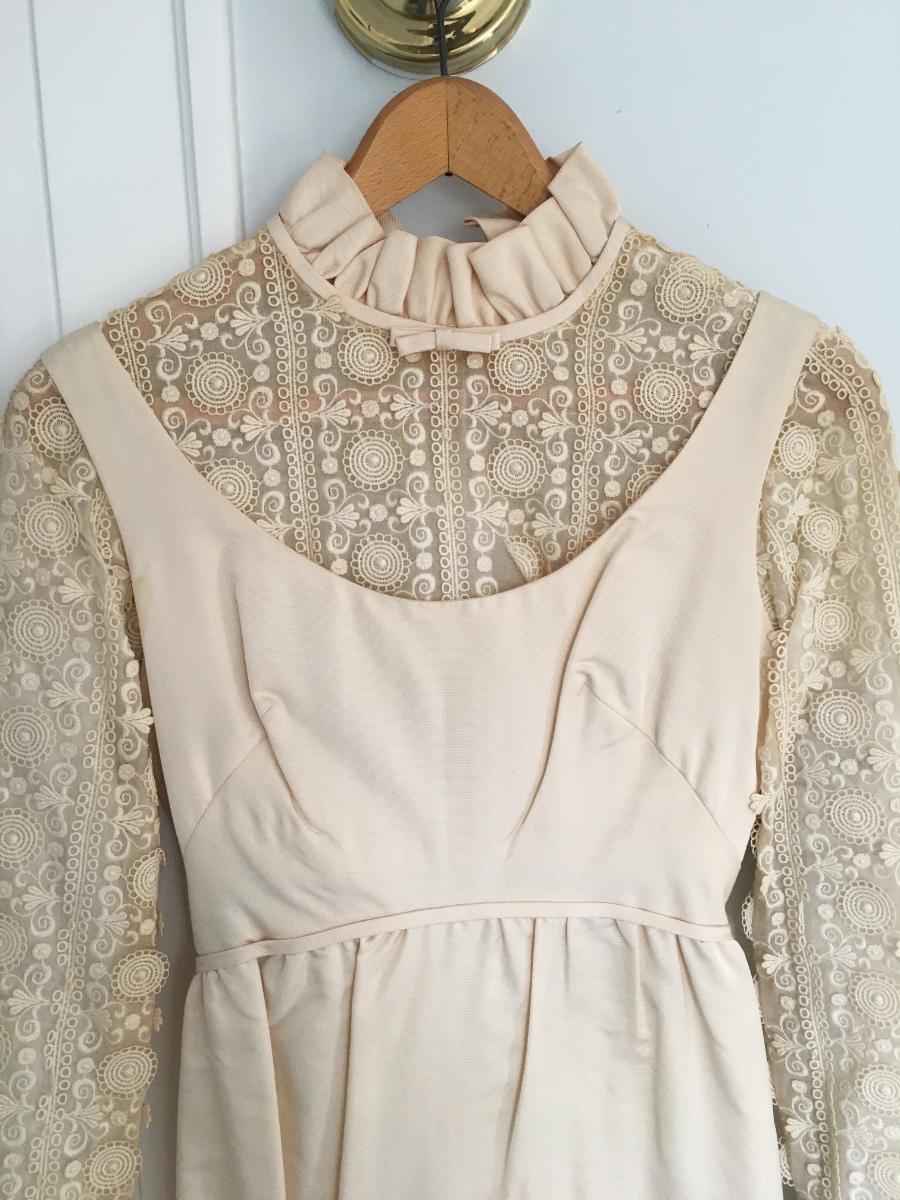1960's 2 piece jumper wedding dress with separate lace long sleeve lace blouse. Ruffle collar matches ruffle at cuff and hem. Excellent condition. Comes with matching 'veil', headband with organza brim.