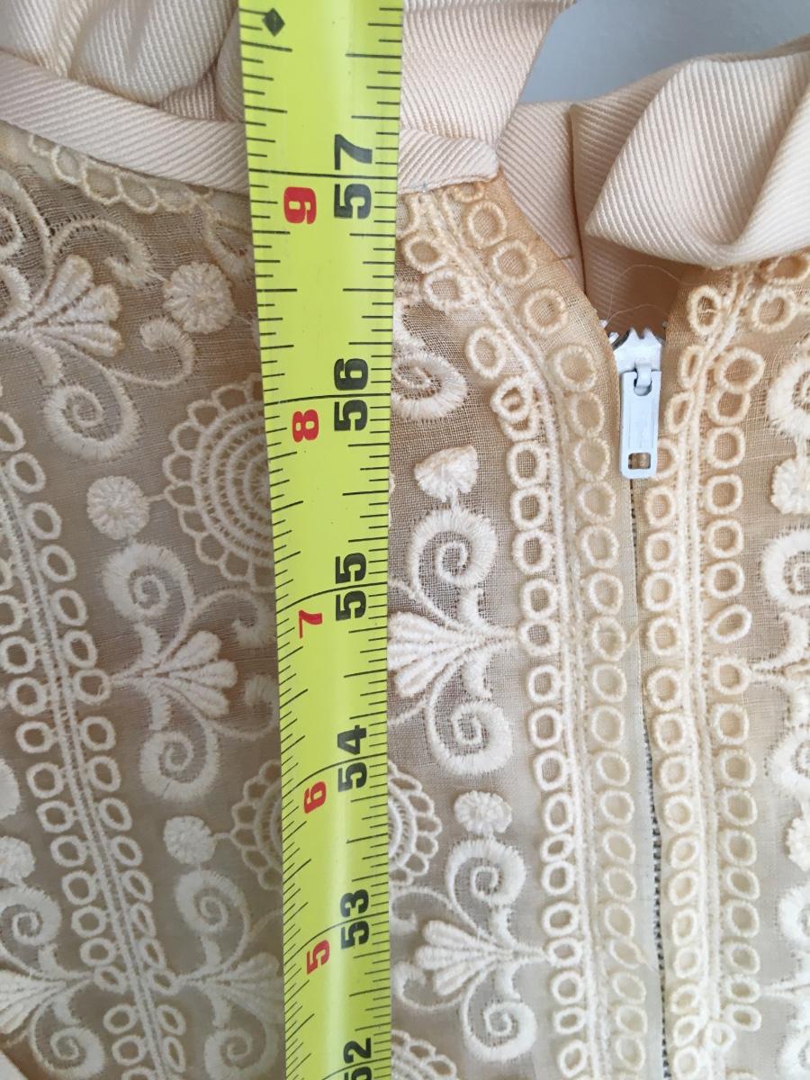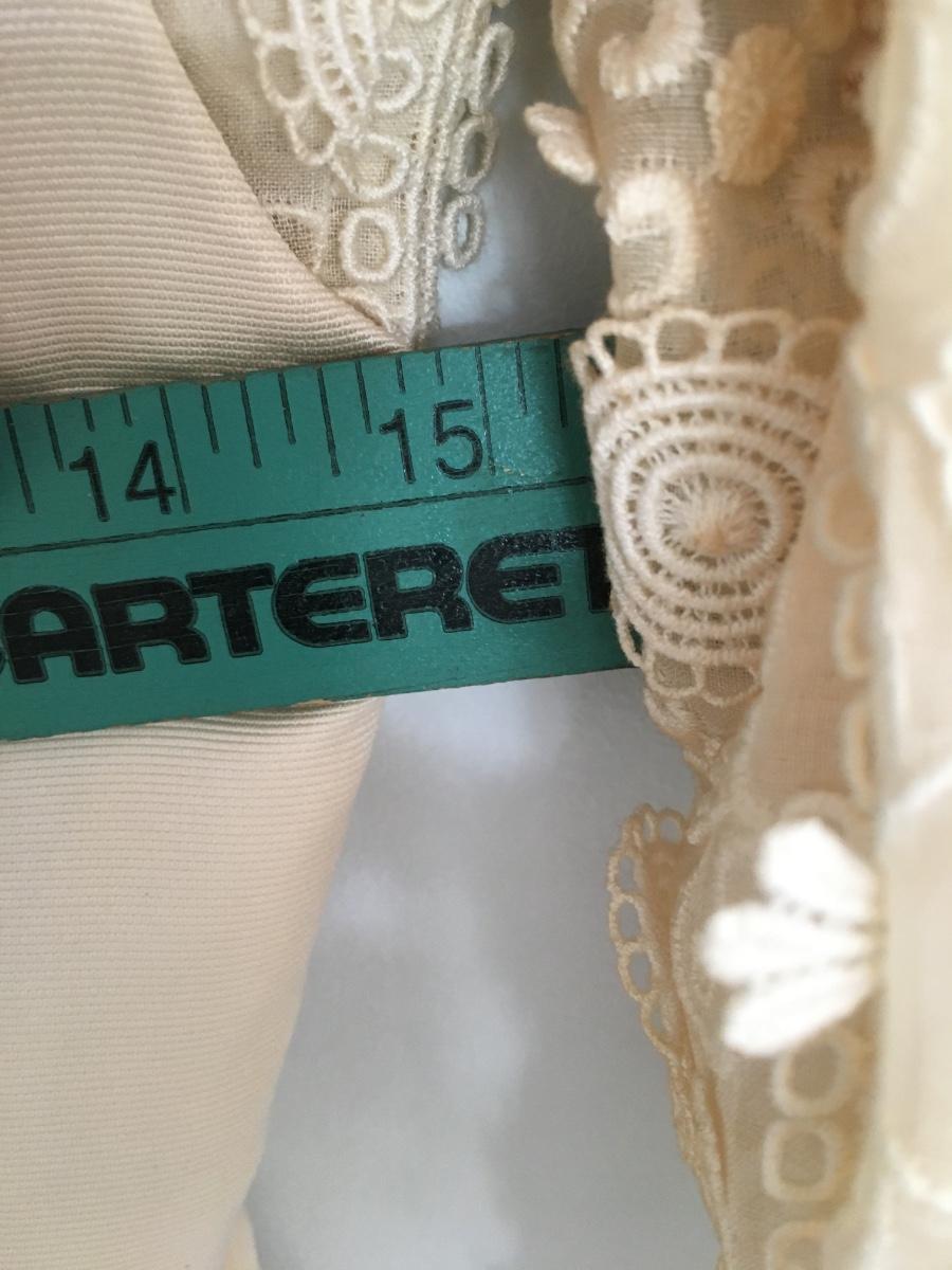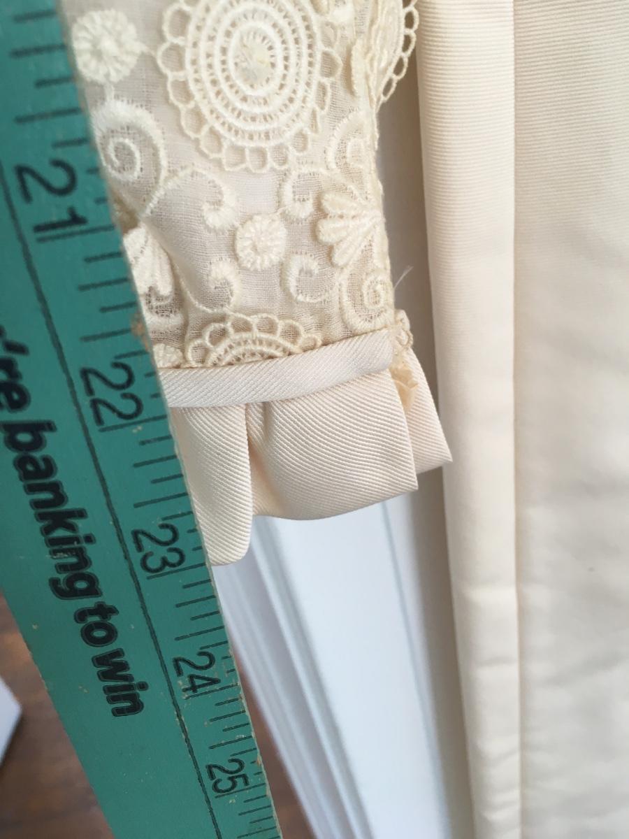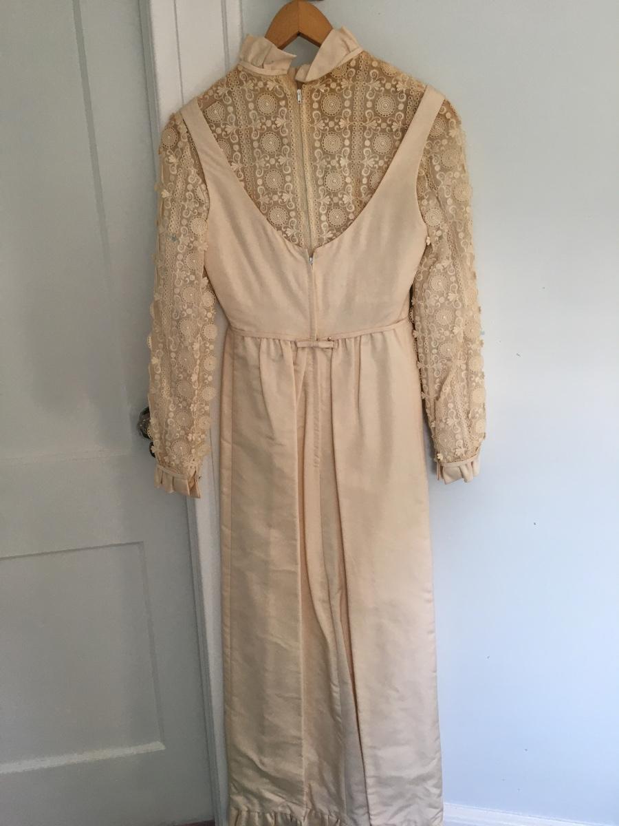 1960's 2 piece jumper wedding dress with separate lace long sleeve lace blouse. Ruffle collar matches ruffle at cuff and hem. Excellent condition. Comes with matching 'veil', headband with organza brim.