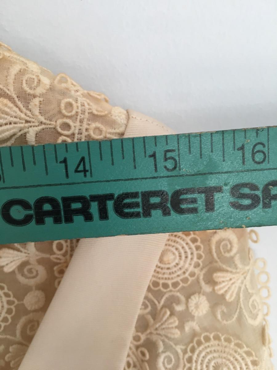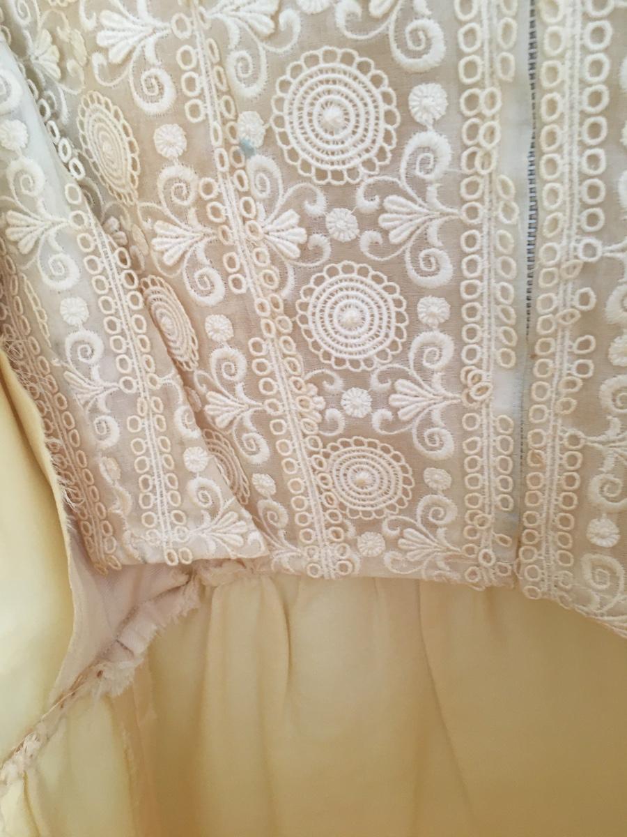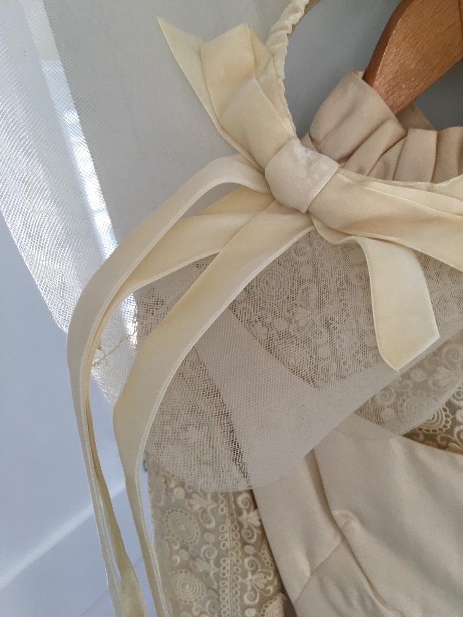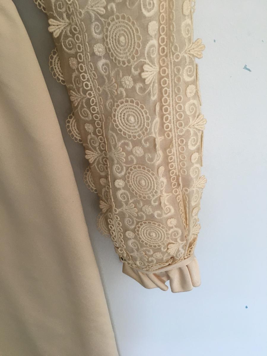 1960's 2 piece jumper wedding dress with separate lace long sleeve lace blouse. Ruffle collar matches ruffle at cuff and hem. Excellent condition. Comes with matching 'veil', headband with organza brim.