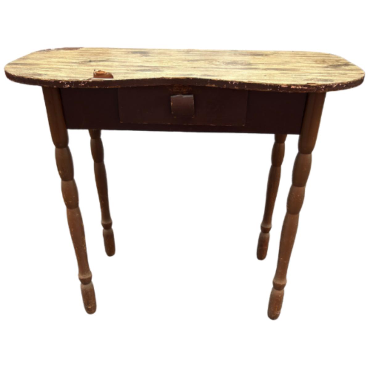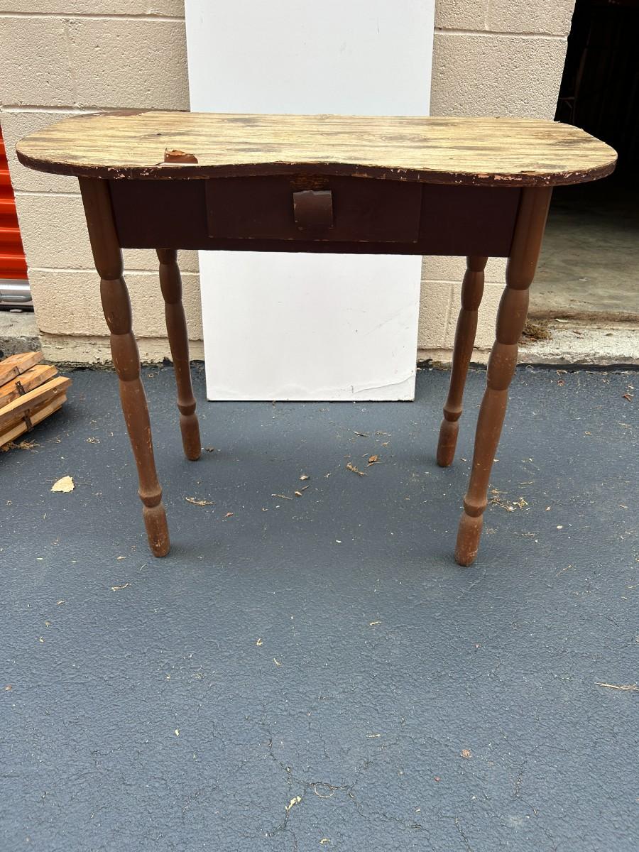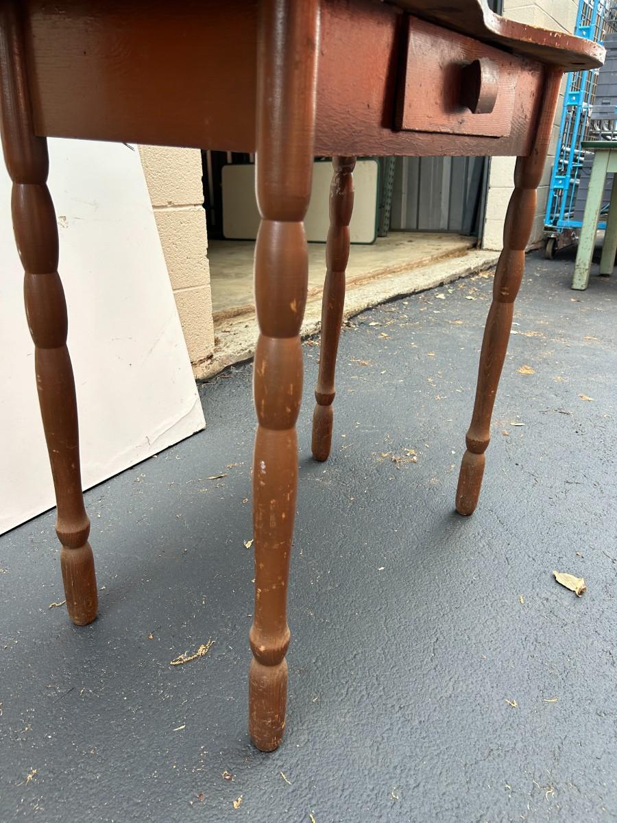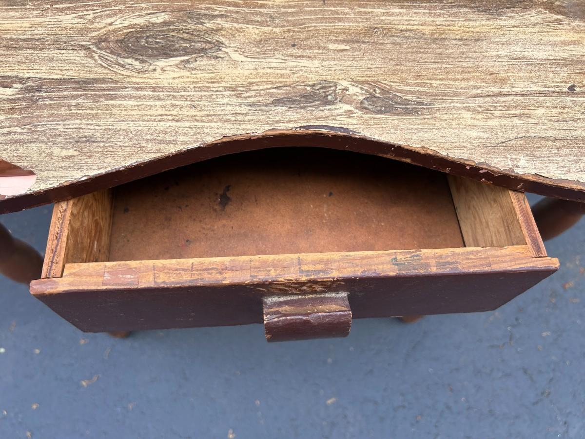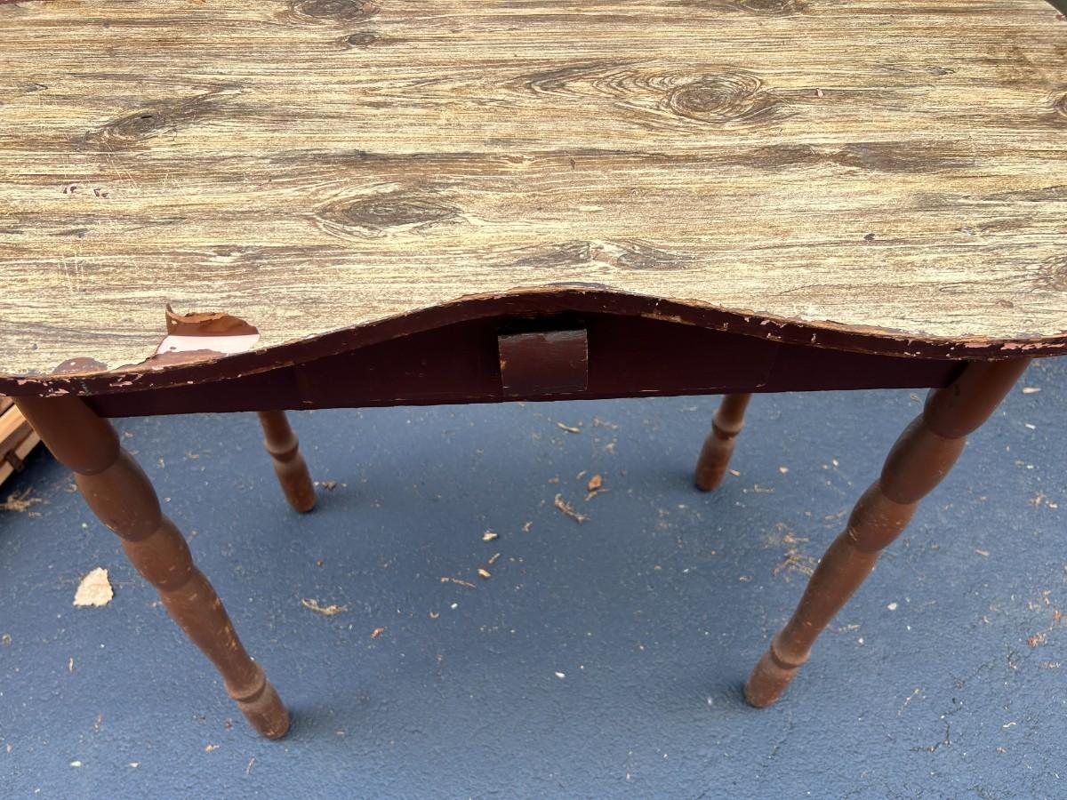 This neglected table is in excellent structural condition, and the drawer slides effortlessly. It is from a defunct movie prop house and needs to be stripped. It has two coats of paint and a peel-and-stick kitchen cabinet laminate on the top. The laminate comes off easily due to its age, and the paint is flaking. Once restored, this will be a beautiful final piece.