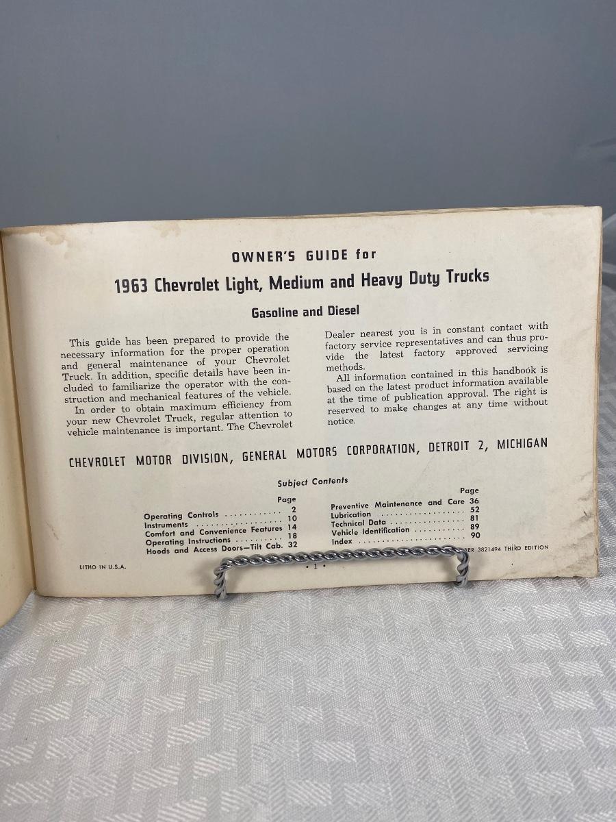 Vintage 1963 Chevrolet Truck Owners Guide Booklet. Fair condition, signs of age, wear, and discolor.