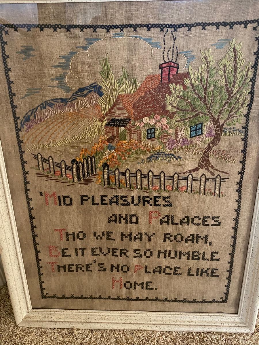 Vintage 1964 Handmade Cross Stitch Needle Point Tea Towel Framed Family Heirloom. Some discoloration from age. Note on who made it and date on the back. Nicely done needlecraft. About 20"x26".