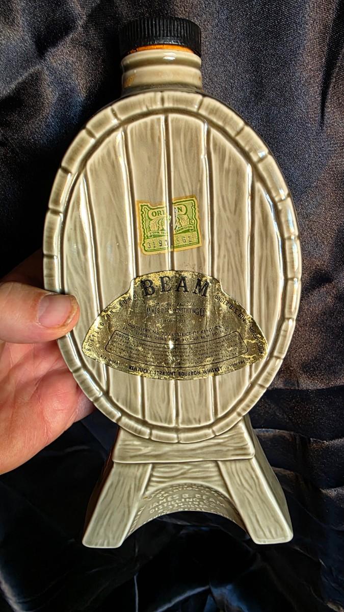 Standing approximately 11 inches tall, it proudly displays the embossed “BEAM – Since 1795” seal at its base, along with its original gold tax strip and distillery label on the reverse. Each marking adds to its historical provenance, connecting it to Kentucky’s storied distilling tradition and the mid-century marketing artistry that turned everyday bottles into enduring collectibles.