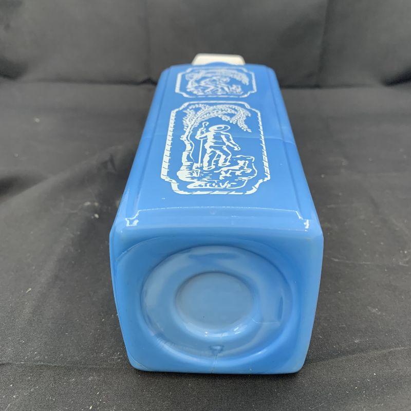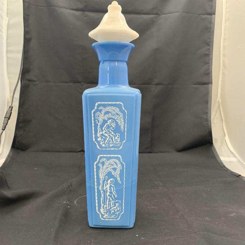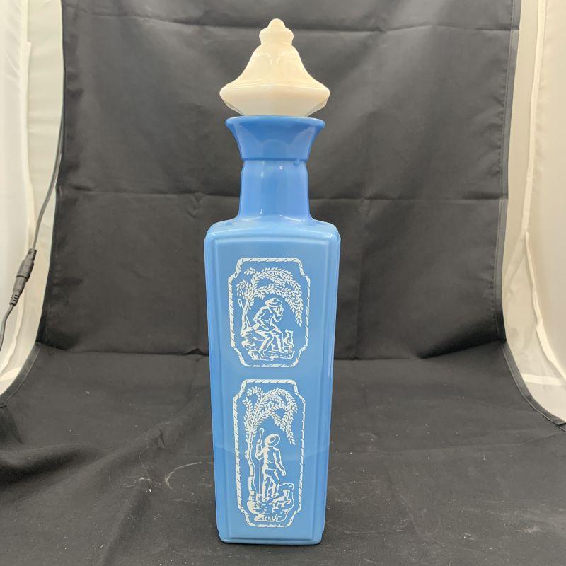 SHEPPARD BOY & HIS DOG blue and white milk glass vintage light blue glass decanter bottle in the picture. It's a beautiful light blue bottle with white scenes of a man with sheepherder stick and his dog on all four sides. Really unique bottle with white top with cork. Made of porcelain, it's a nice, older heavy one.