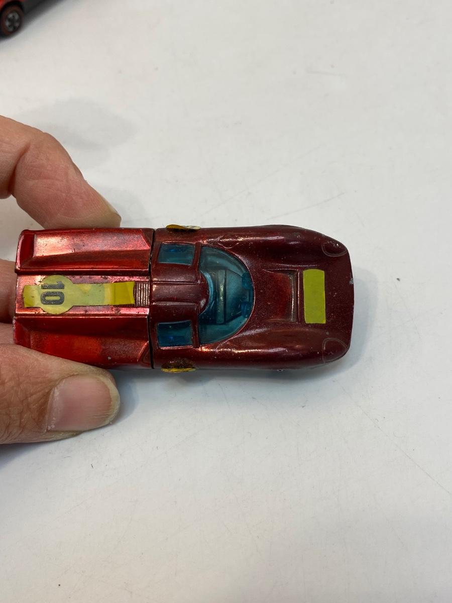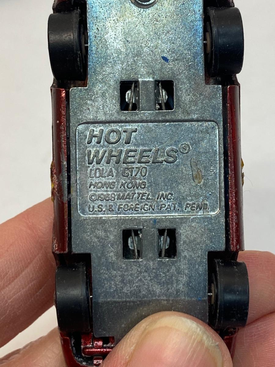 Vintage 1968 Hot Wheels Red Line Lola GT 70 & Splittin Image Die Cast Cars. In play worn condition, looks like someone may have tried to paint the chips at one time.