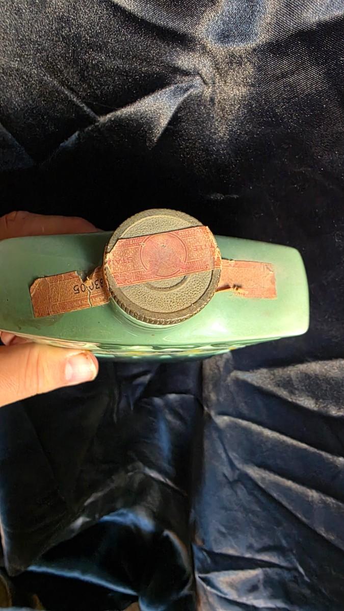 The decanter’s bold, embossed lettering spells out RENO 100 YEARS across its façade, while the central painted medallion captures the essence of the city — skiing in the Sierras, casino lights, desert rodeos, and the charm of lakeside leisure. Its soft jade-green glaze with subtle sheen contrasts beautifully with colorful hand-painted vignettes, encapsulating the playful confidence of 1960s Americana.