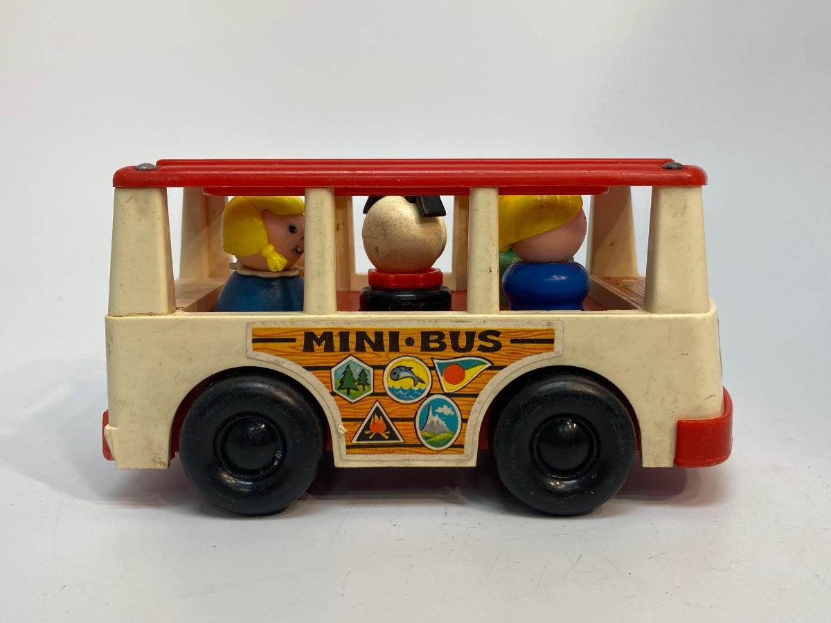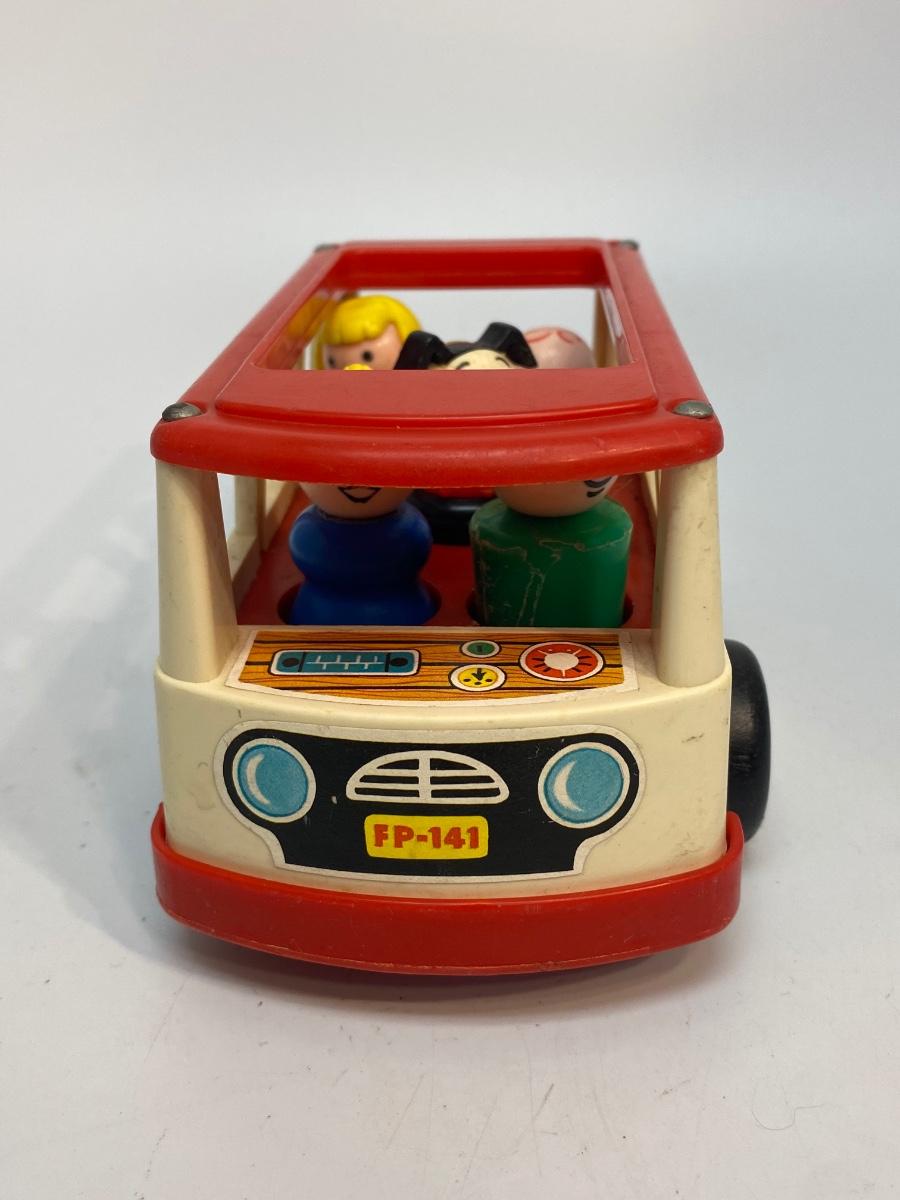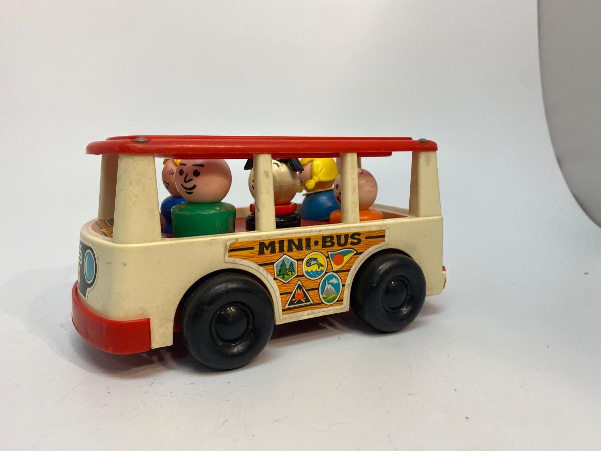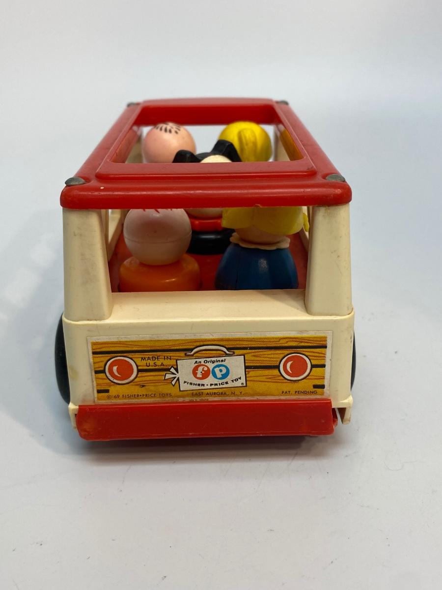 Vintage 1969 Fisher Price Play Family Mini Bus #141. In good played with condition. People bounce up and down when pushed along. Comes with family and dog. Original set had wood people and changed through the years to plastic, these are the right people just not all are wood.