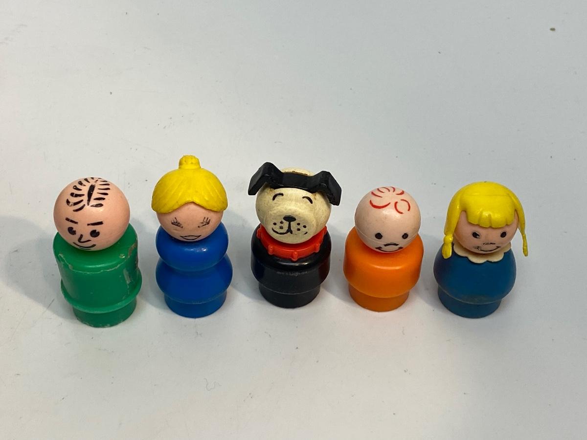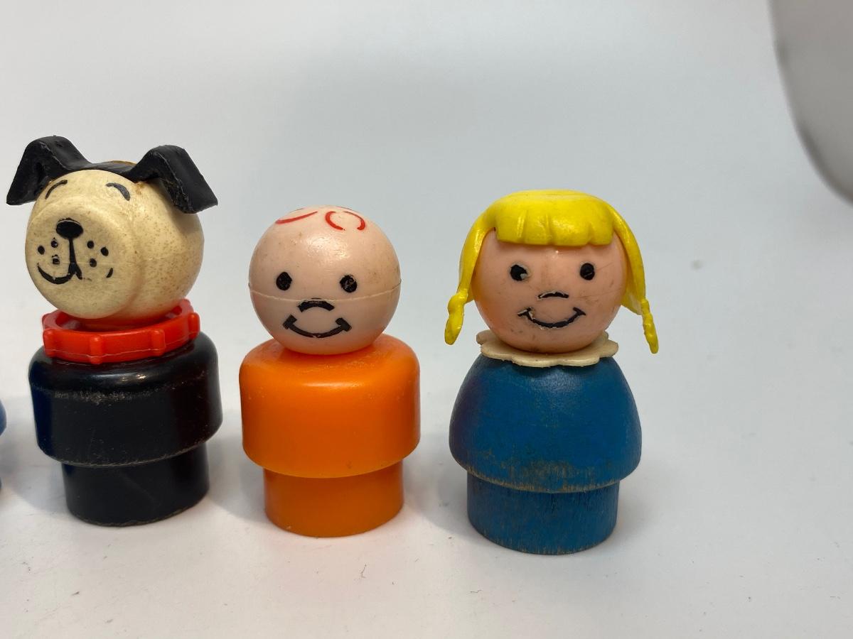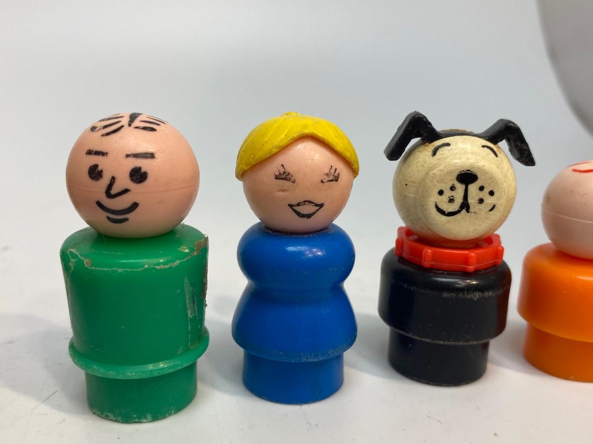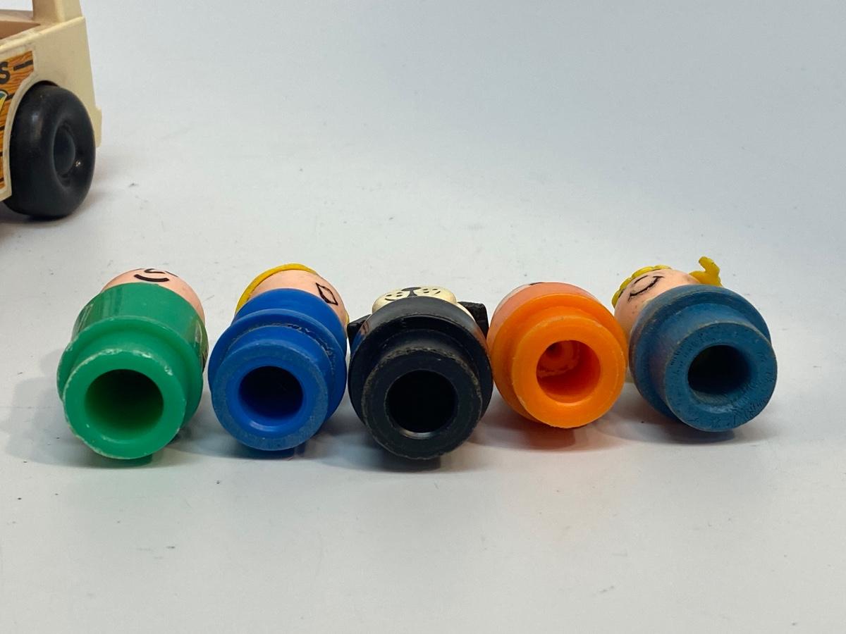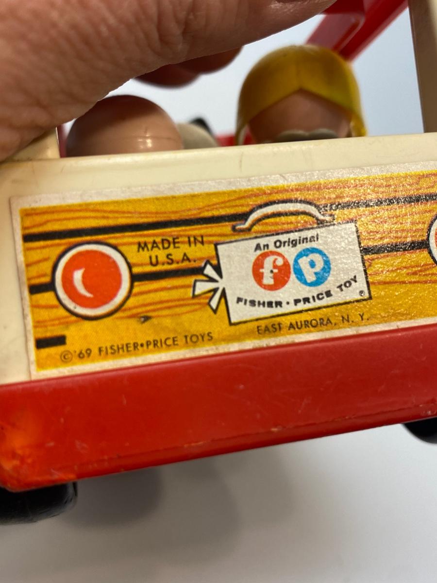 Vintage 1969 Fisher Price Play Family Mini Bus #141. In good played with condition. People bounce up and down when pushed along. Comes with family and dog. Original set had wood people and changed through the years to plastic, these are the right people just not all are wood.