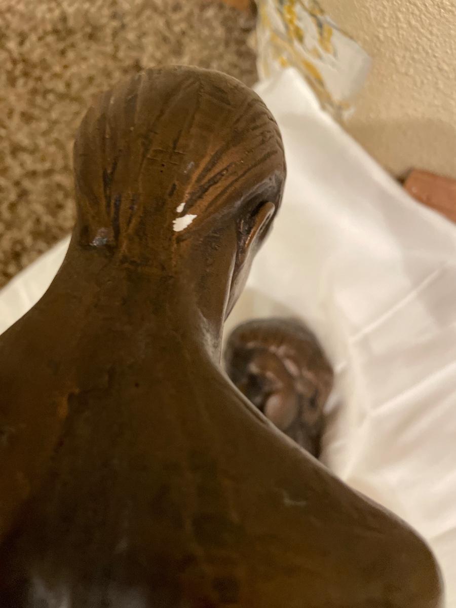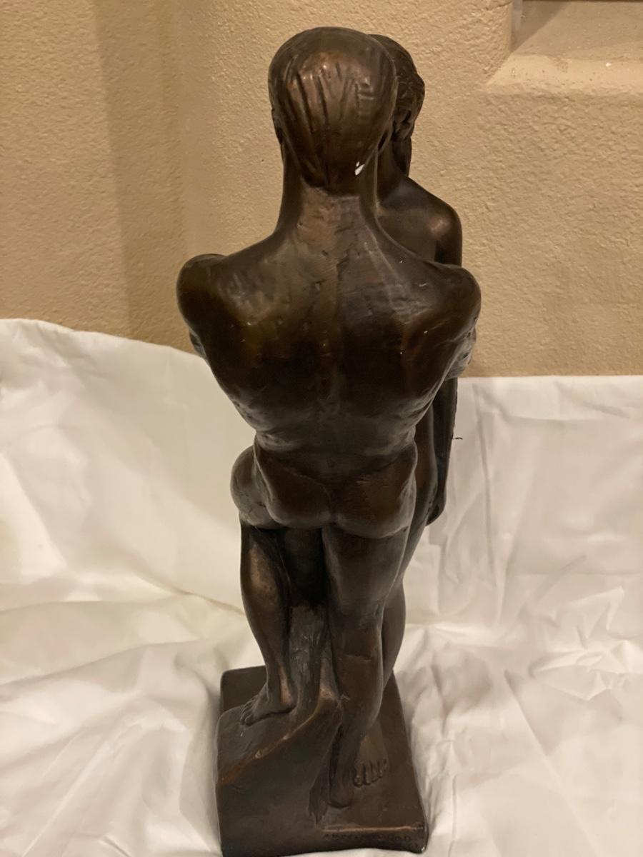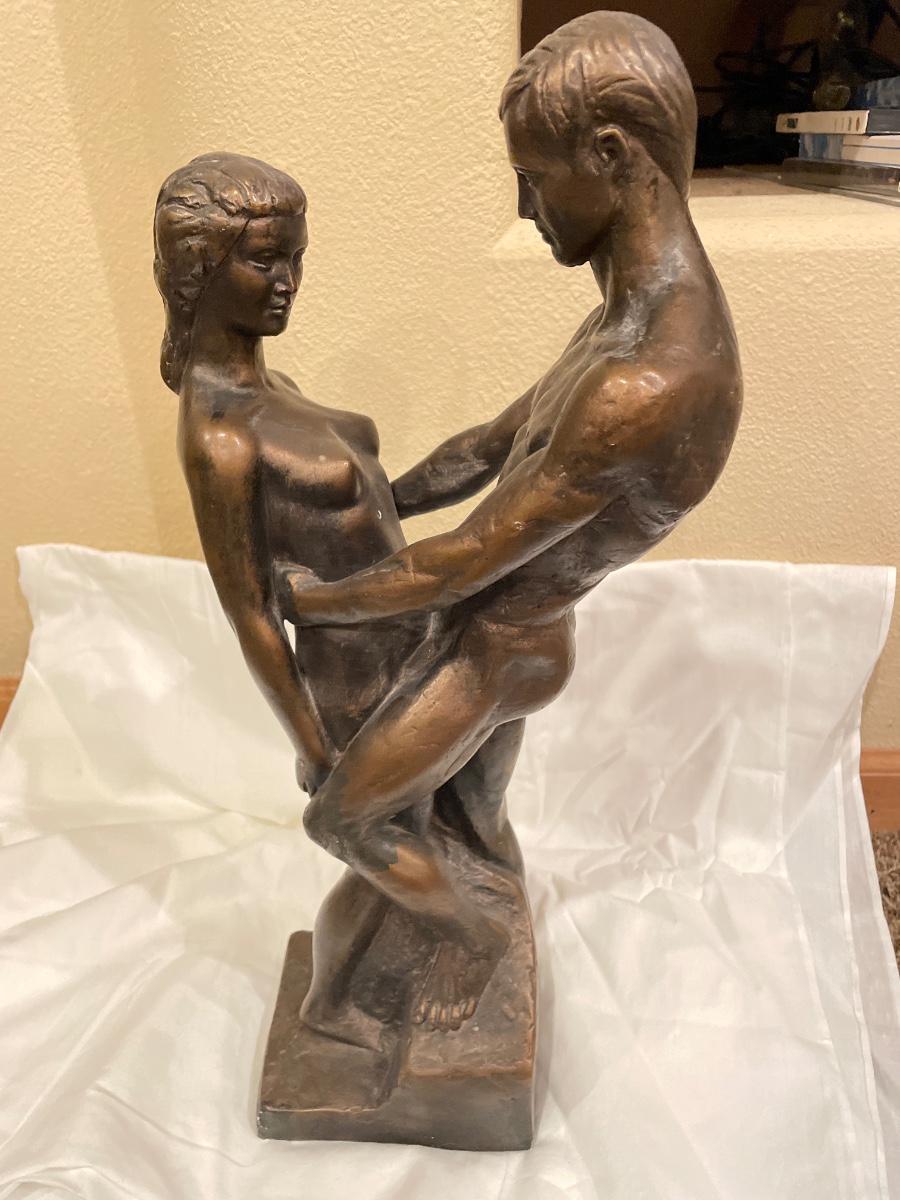 Measures 18" tall on a 5 1/4" x 4 3/4" base with felt on bottom. Has a small chip on males head. Item is painted plaster and very heavy.