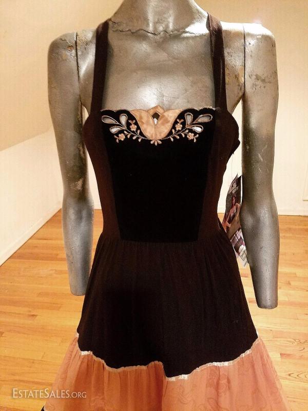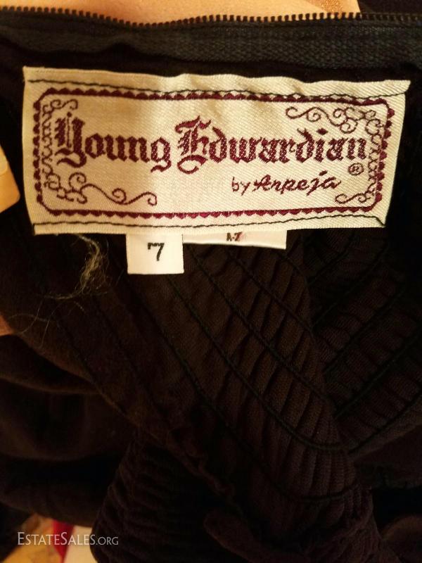 This one is a stunner from the early 1970's Young Edwardian by Arpeja They had whole departments at Saks 5th Avenue and Lord & Taylor and were the hottest line in the late 1960's early 1970's. This one is a size 7 The top bodice is stretch gathered at back elastic .