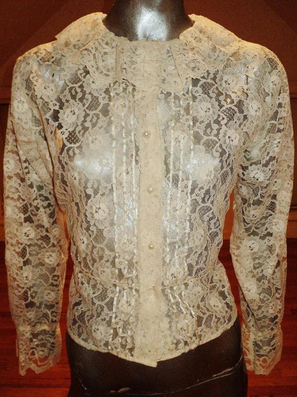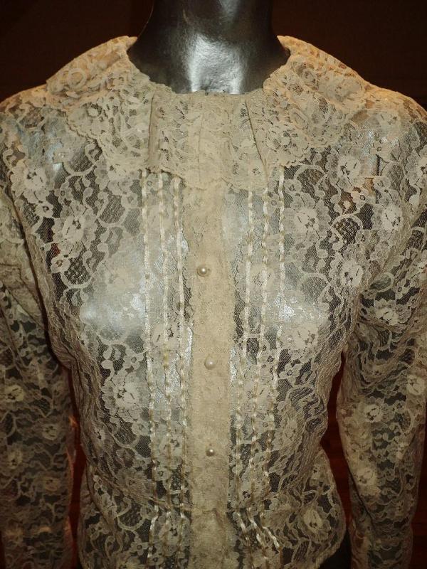 Gorgeous all laced Poet style blouse with ruffle details and pearl buttons in an egg shell coloration
