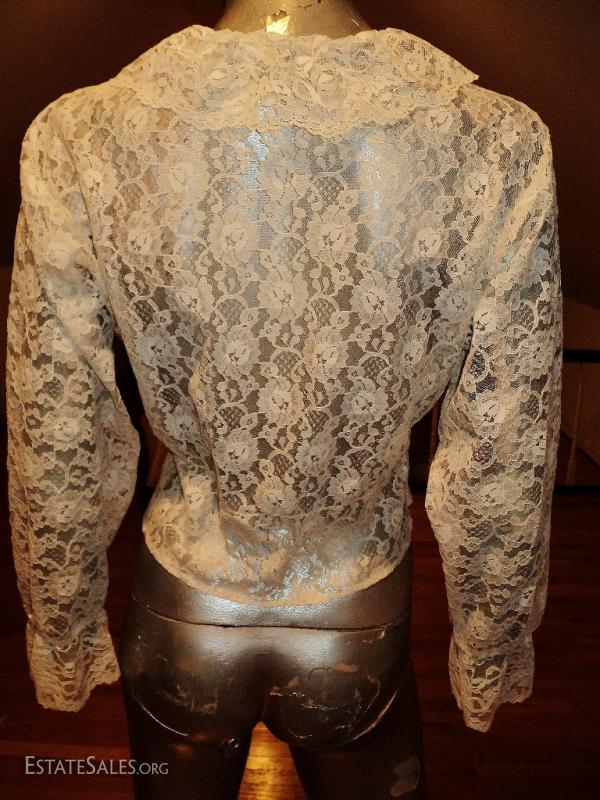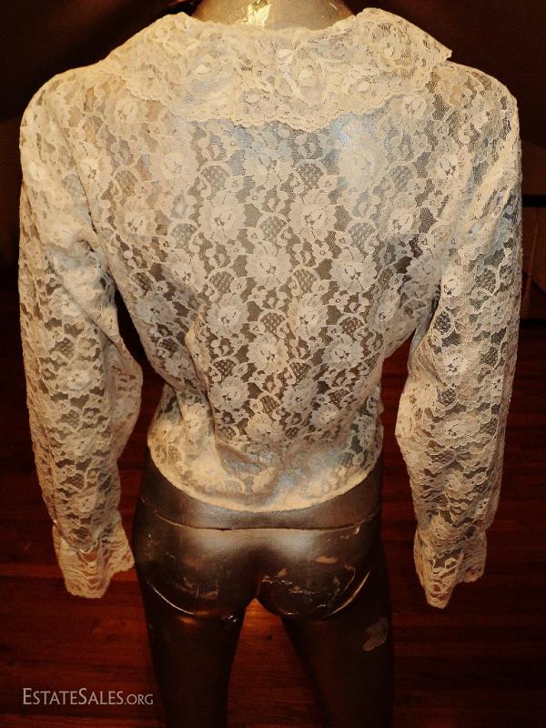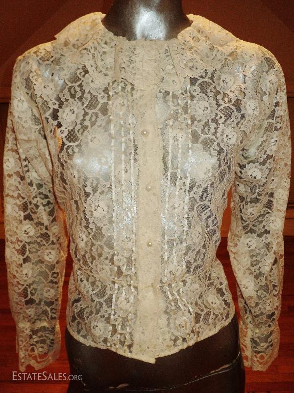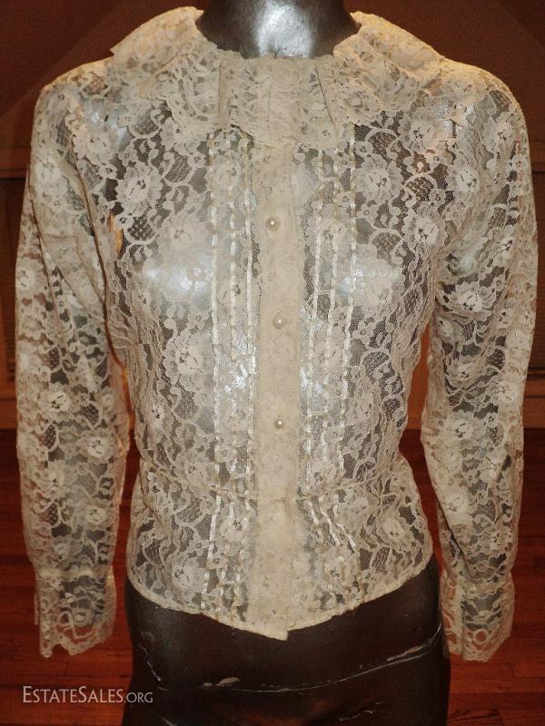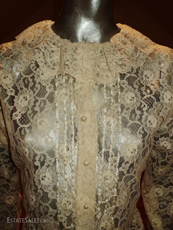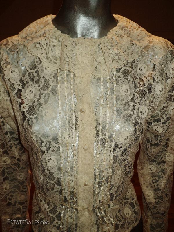 Gorgeous all laced Poet style blouse with ruffle details and pearl buttons in an egg shell coloration