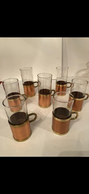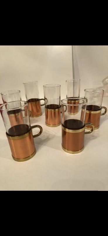 Collectible Item - Set Of Seven Special Beucler Irish Coffee Glass Mugs in excellent condition. Stamped copper base/holder with gold trim and handle. Glass is in tact with no chips.