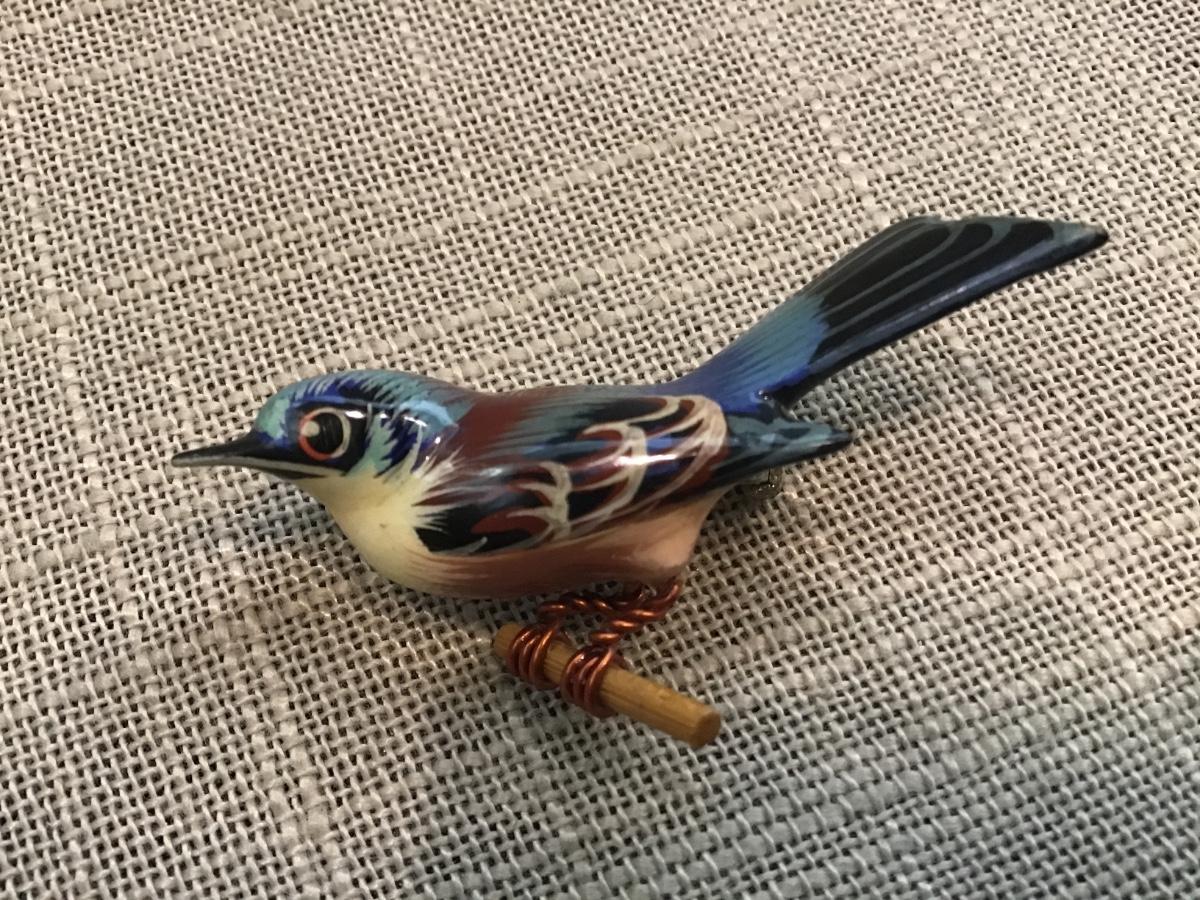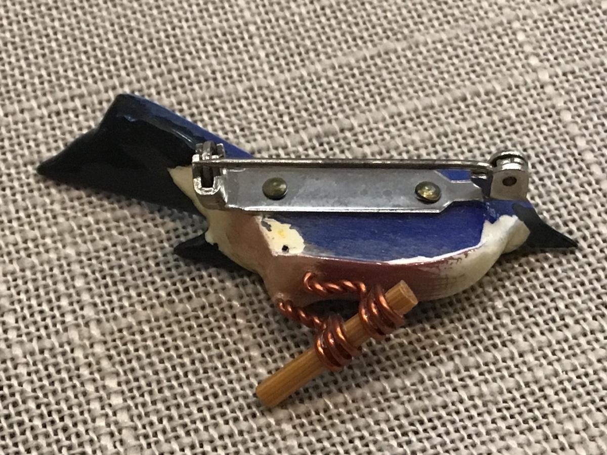 Vintage 1970's Blue Bird Takahashi Style Carved Hand Painted Wooden Brooch Pin