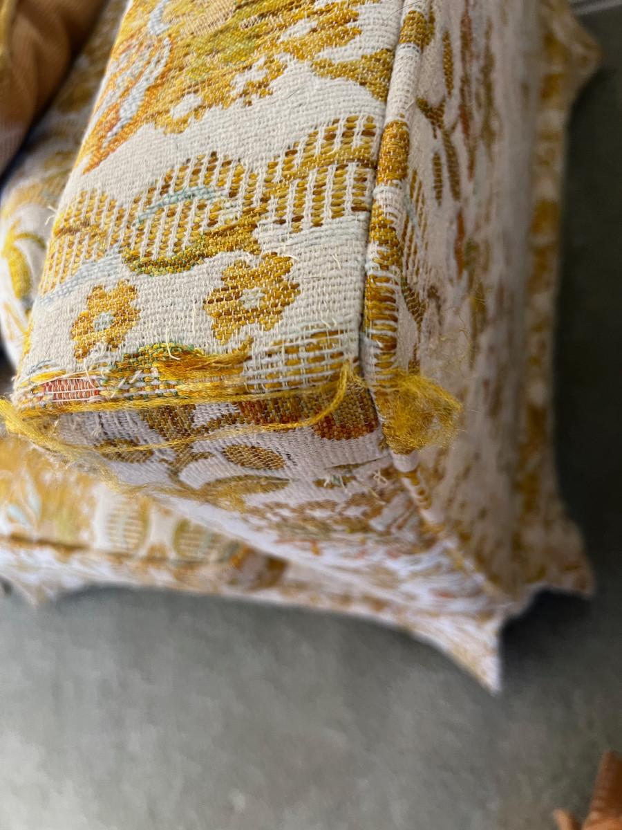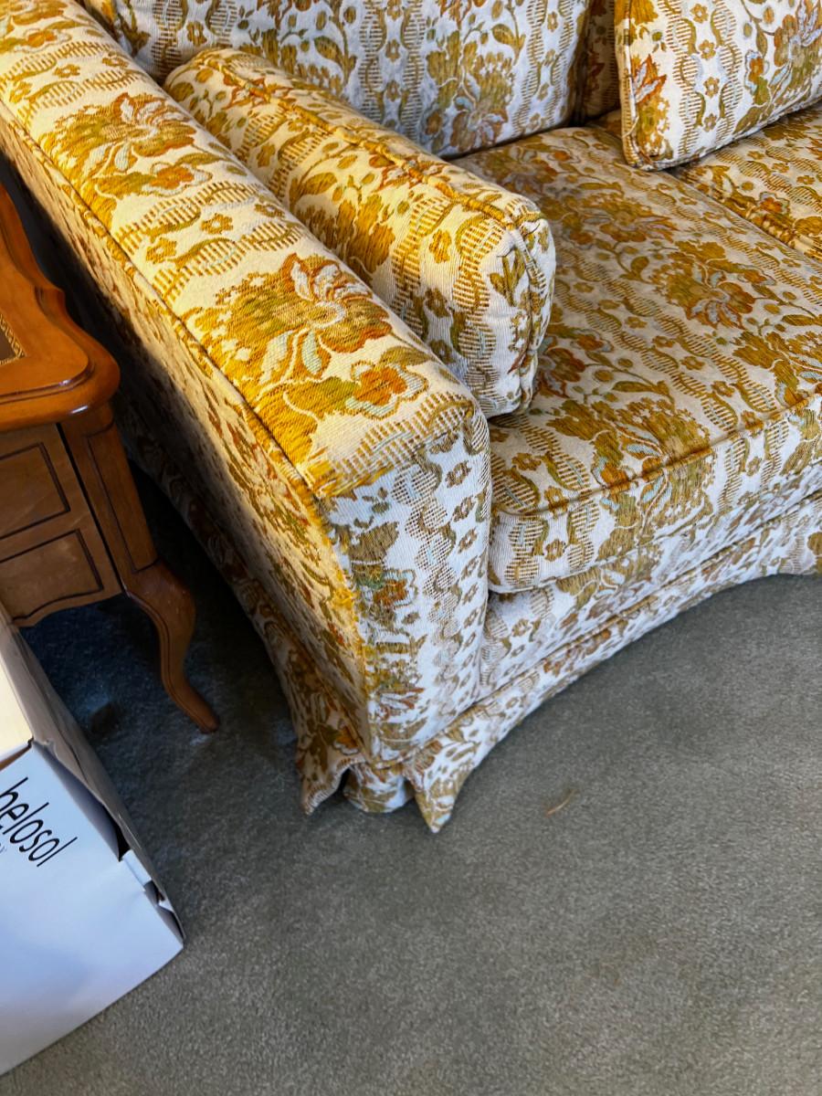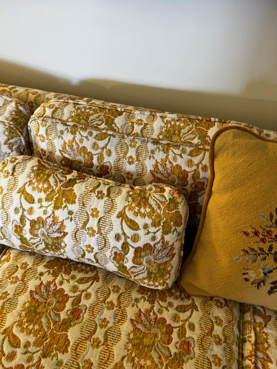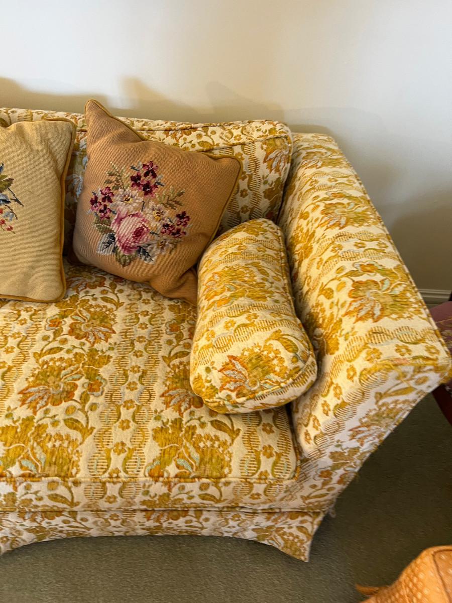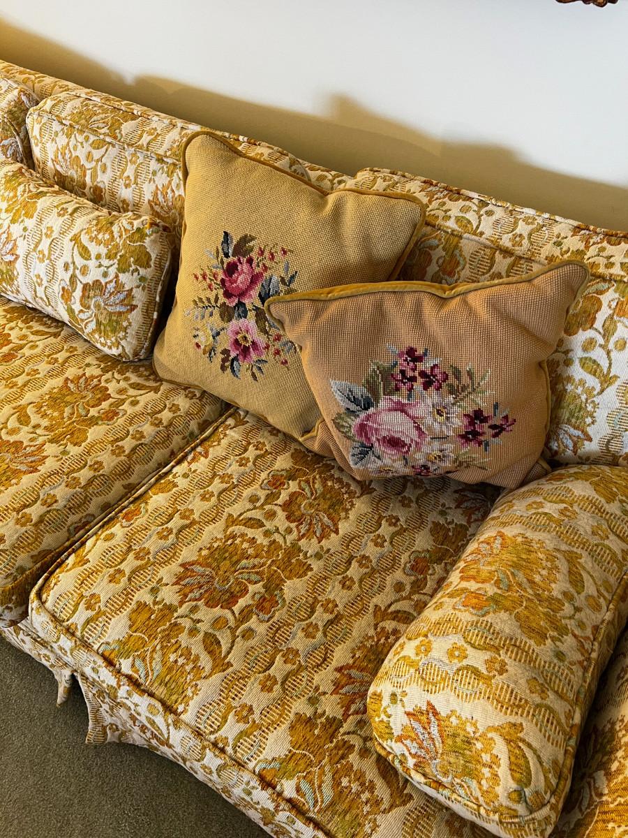 90" Inches long. Shows wear. Comes from a clean home and includes the needlepoint pillow.