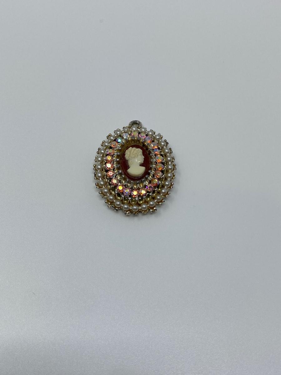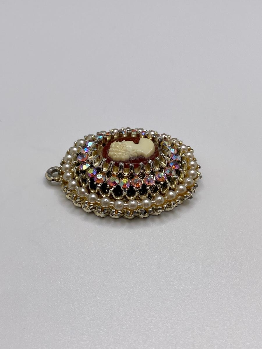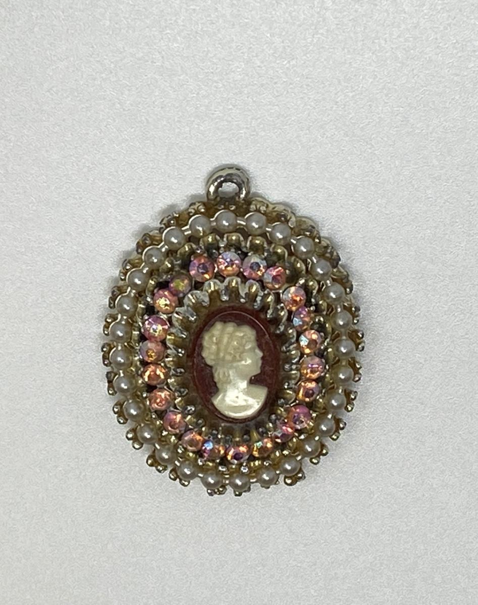 Vintage 1970s Cameo Pendant with Pink Aurora Borealis Rhinestones and Cream Pearls. 1.75" T