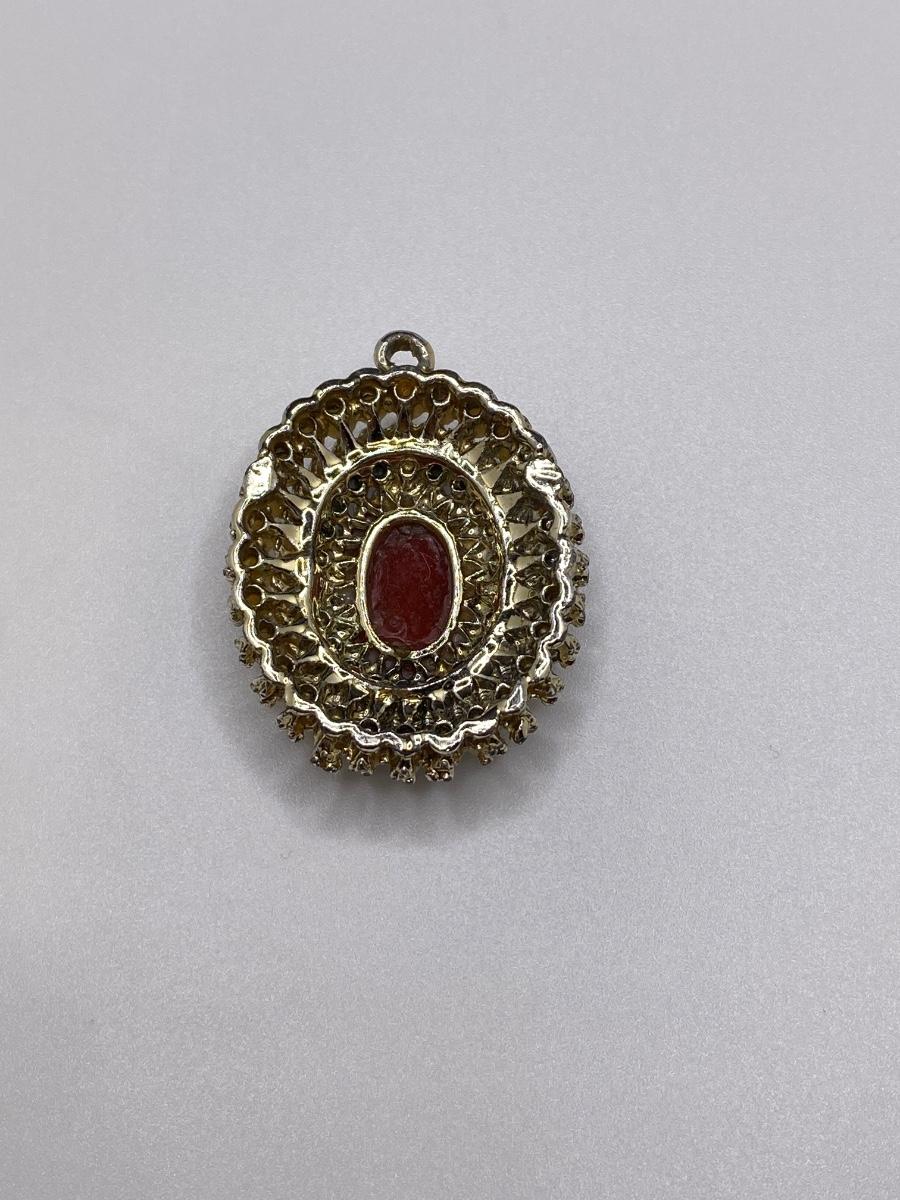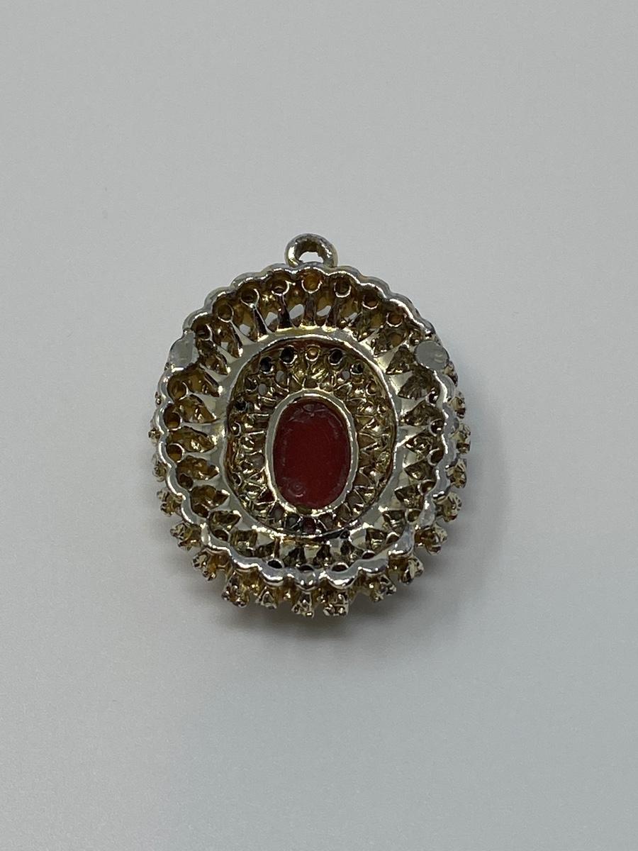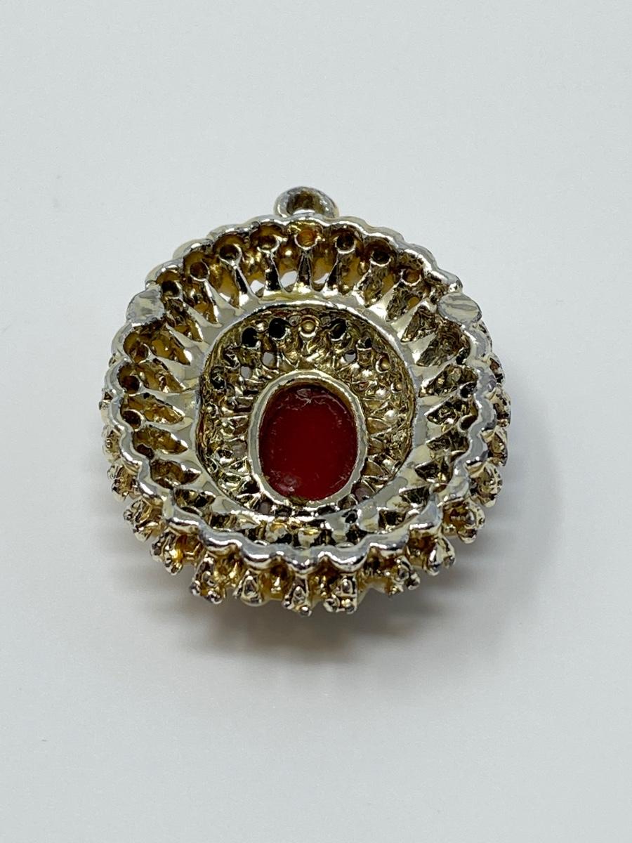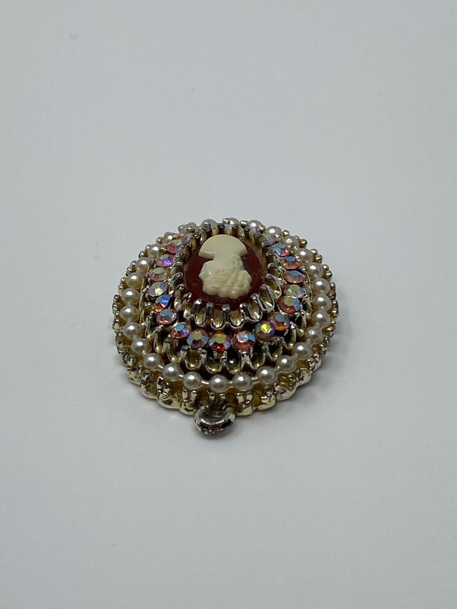 Vintage 1970s Cameo Pendant with Pink Aurora Borealis Rhinestones and Cream Pearls. 1.75" T