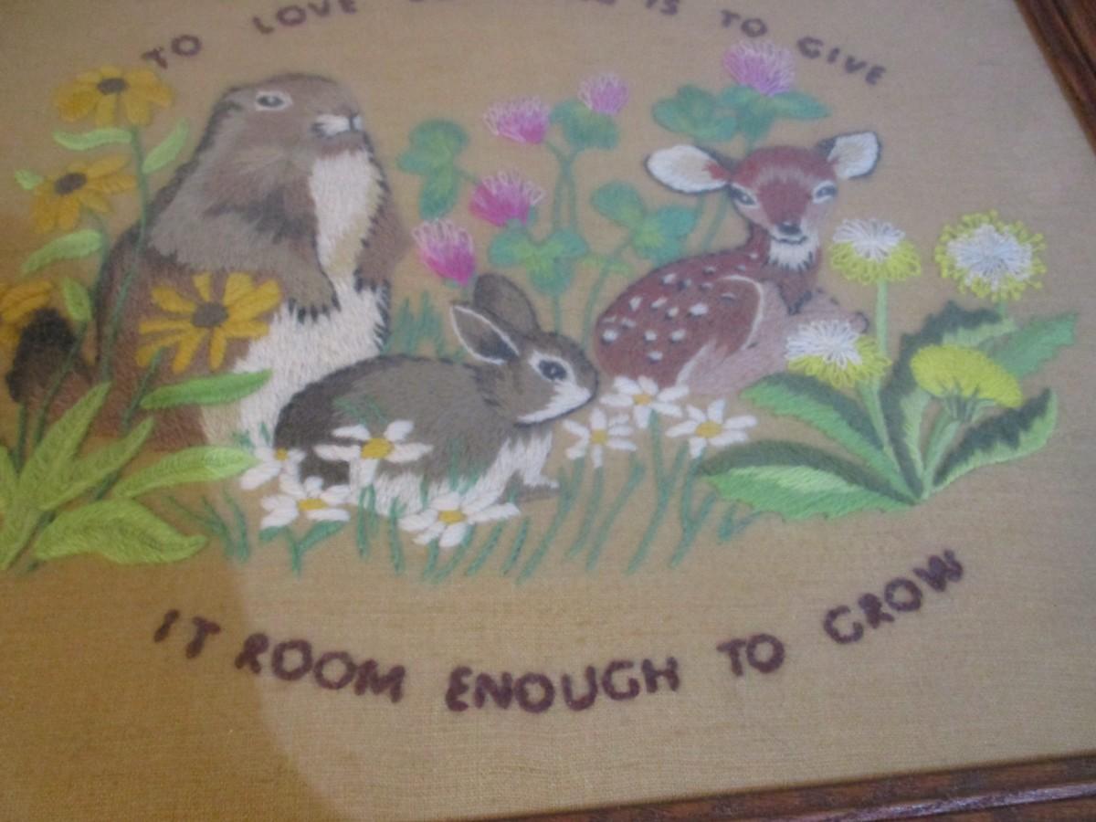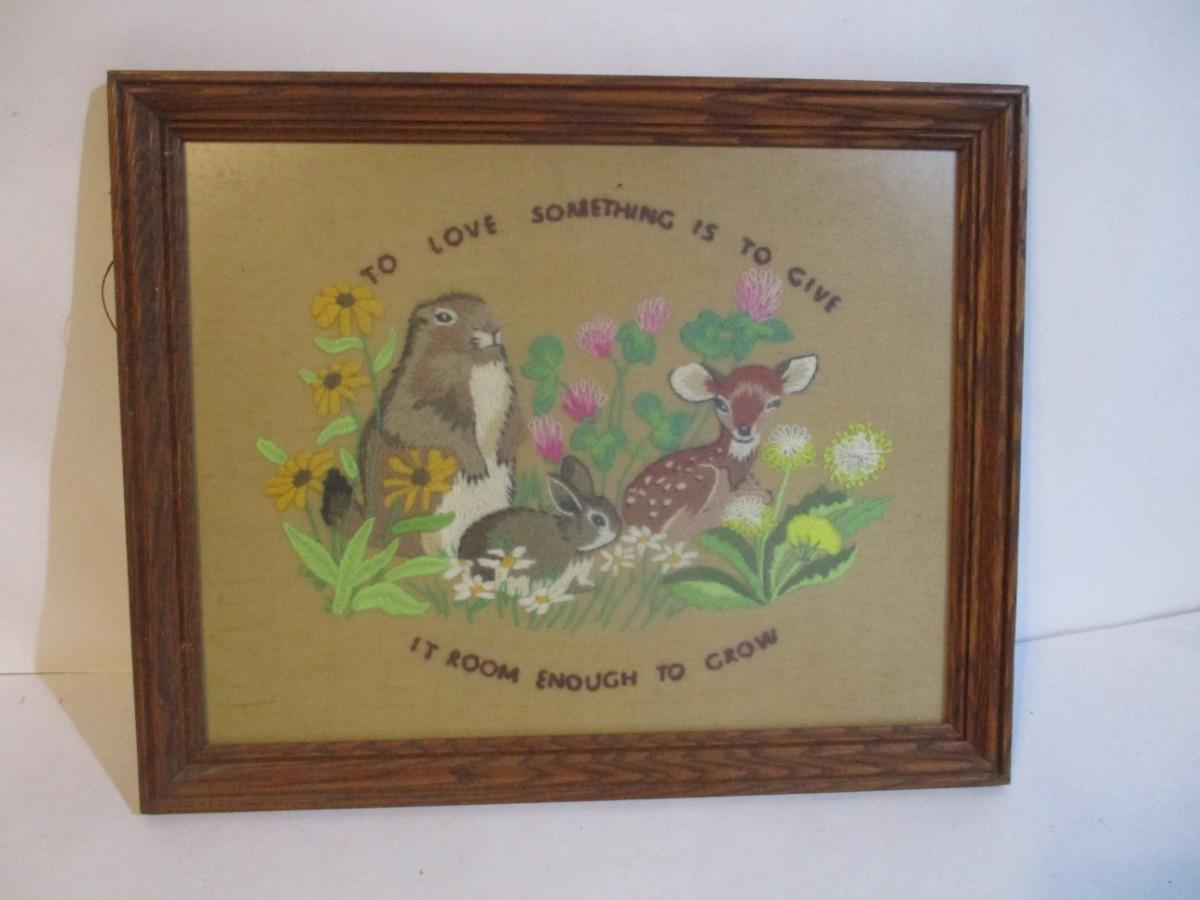 Approx 20 1/4" x 16 1/4" Vintage 1970's Completed "To Love Something" Crewel Embroidery