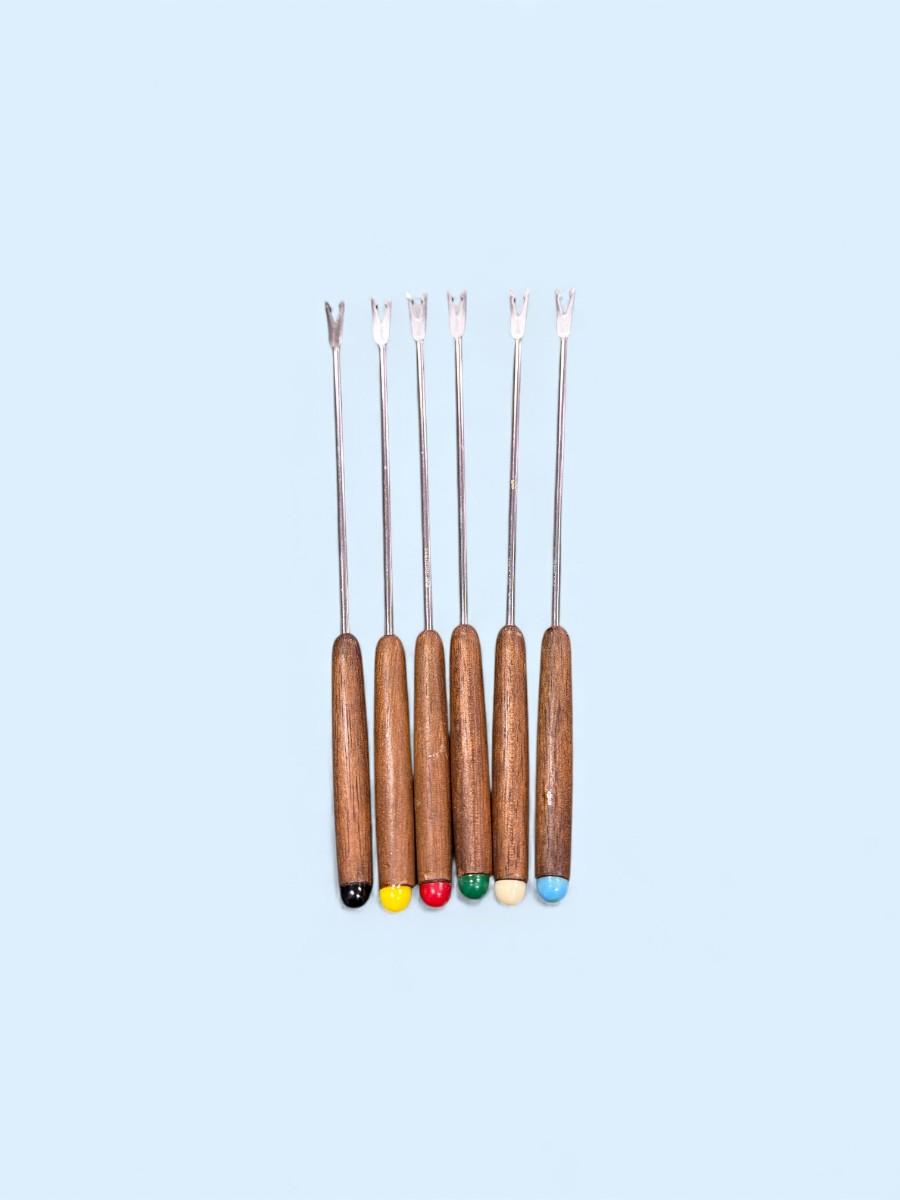 Vintage 1970's Enamel Fondue set with a Floral Design. Set includes Enamel Finished Pot with wooden handle, Enameled Lid, Black Stand, Six Fondue Forks and a sterno burner cup for heating. Also includes Better Homes and Gardens Fondue Book. This unit is in excellent condition.