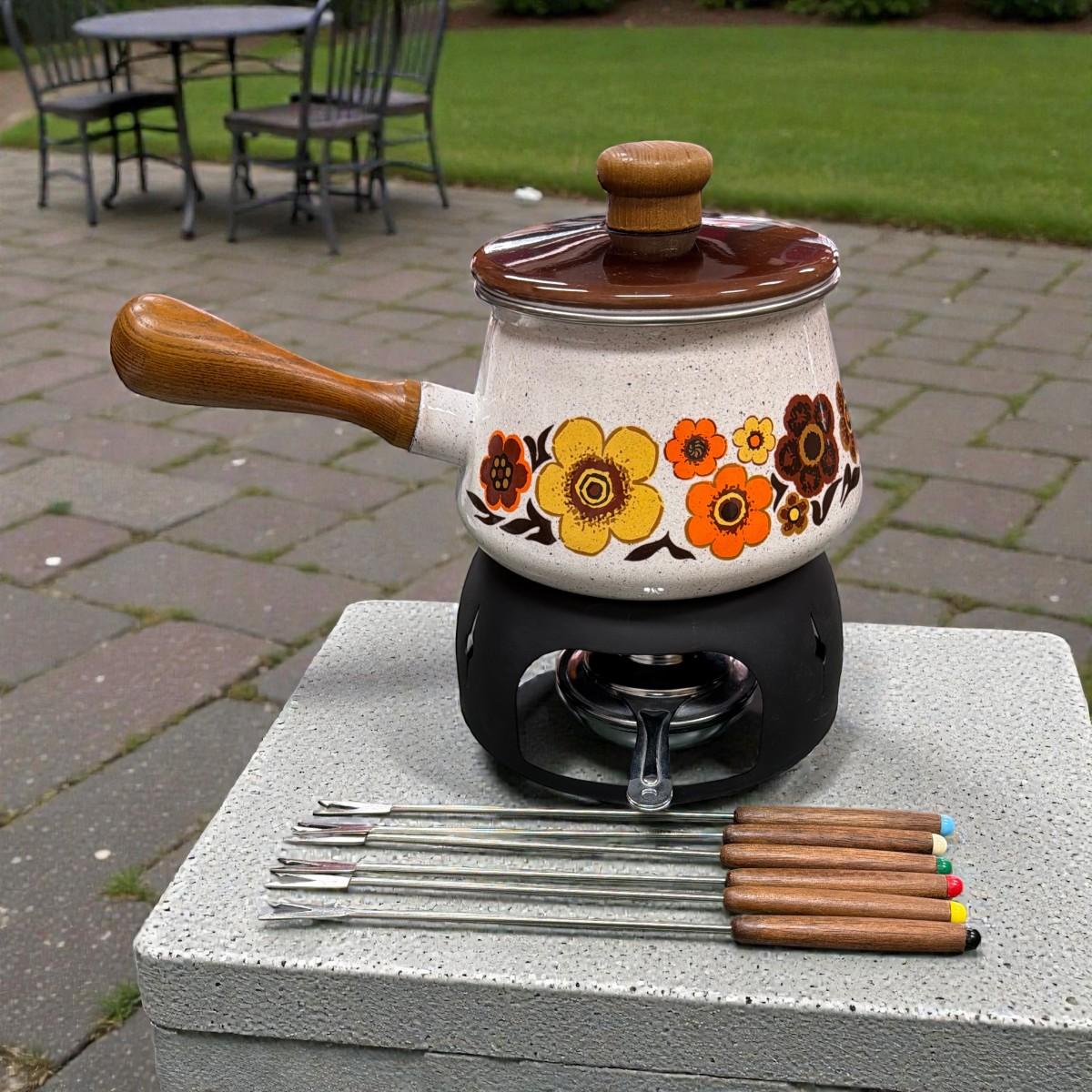 Vintage 1970's Enamel Fondue set with a Floral Design