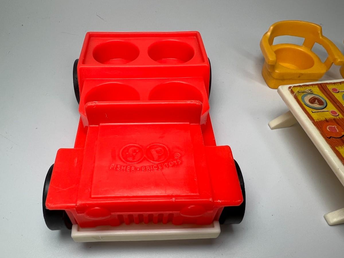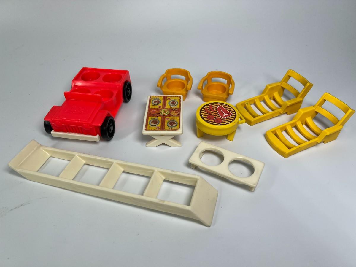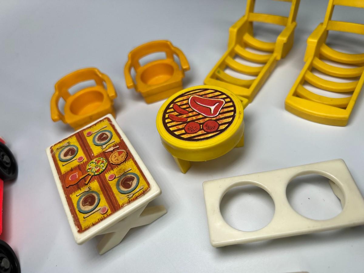 Vintage Fisher Price Little People Play Family "A" Frame play set #990. Made in 1974-76. Good played with vintage condition. Included in the set is the A Frame House, Yellow Bunk Beds (2 sets), 2 yellow lounge chairs, 2 yellow captain chairs, yellow BBQ with sticker attached, white picnic table with sticker attached, 1 picnic table bench (1 missing), white ladder, red and white car, green dad with black heat-stamped hair, blue mom with fancy eyes, and a blonde ponytail, yellow boy smiling, with freckles, eyebrows, and a red baseball cap facing forward, red girl with a blonde bob with bangs, black dog with a red collar. Originally all the people were wood with plastic bodies, the girl, boy, and dog are identical to originals but seem to be plastic body. The foam for bunkbeds has disintegrated, which is common with the foam that was used. Decals are in good, aged condition, none missing just light wear.