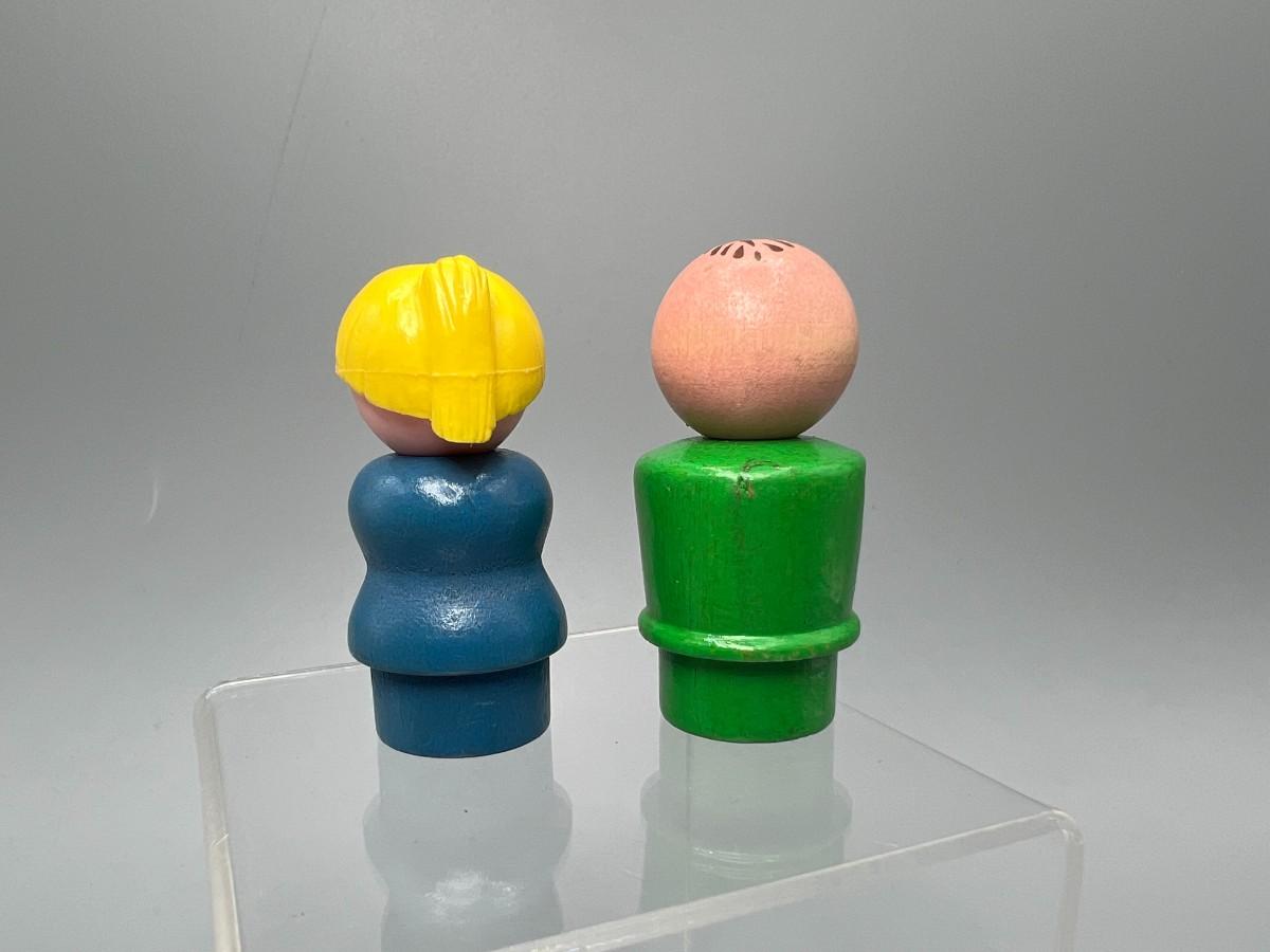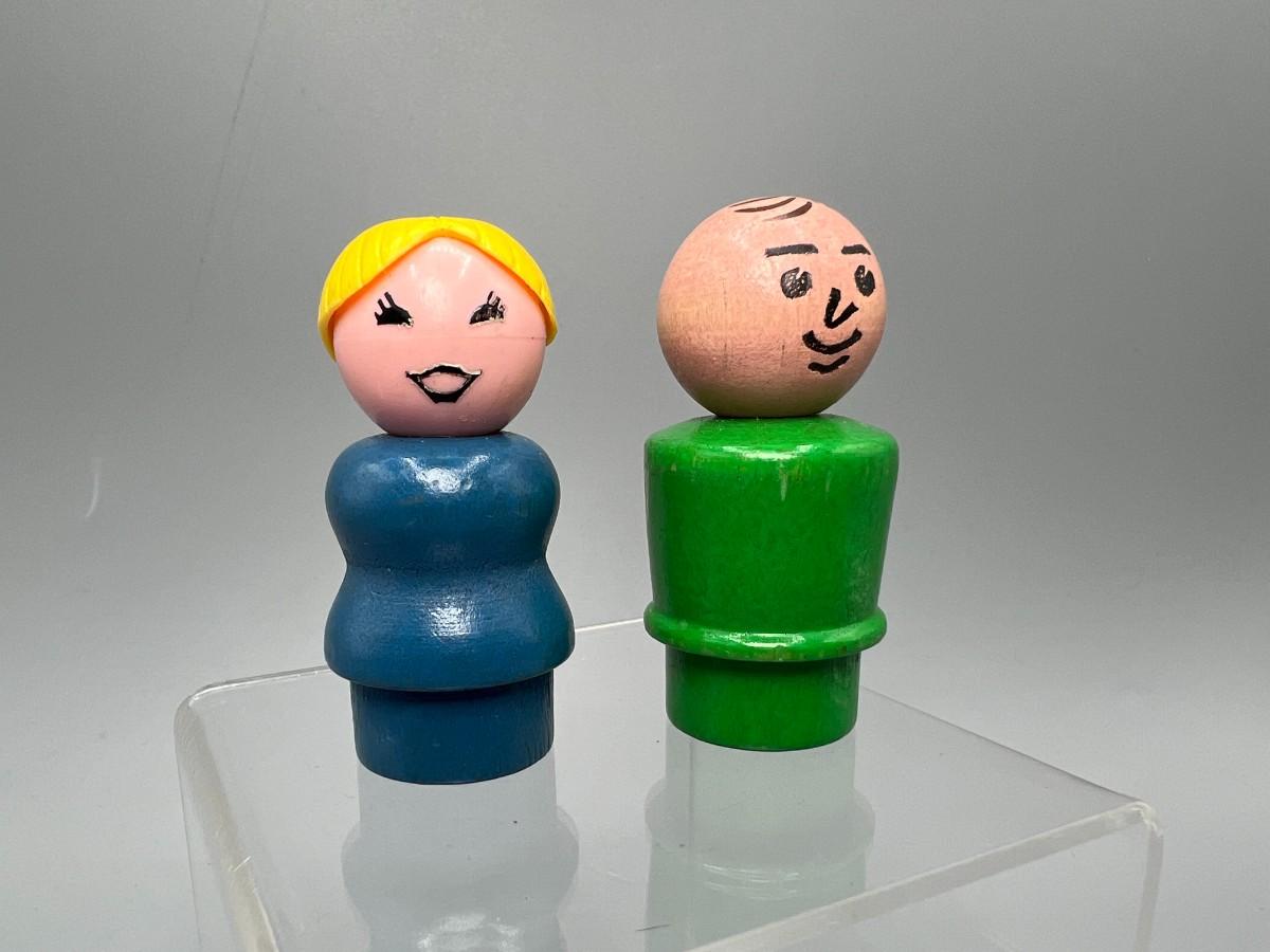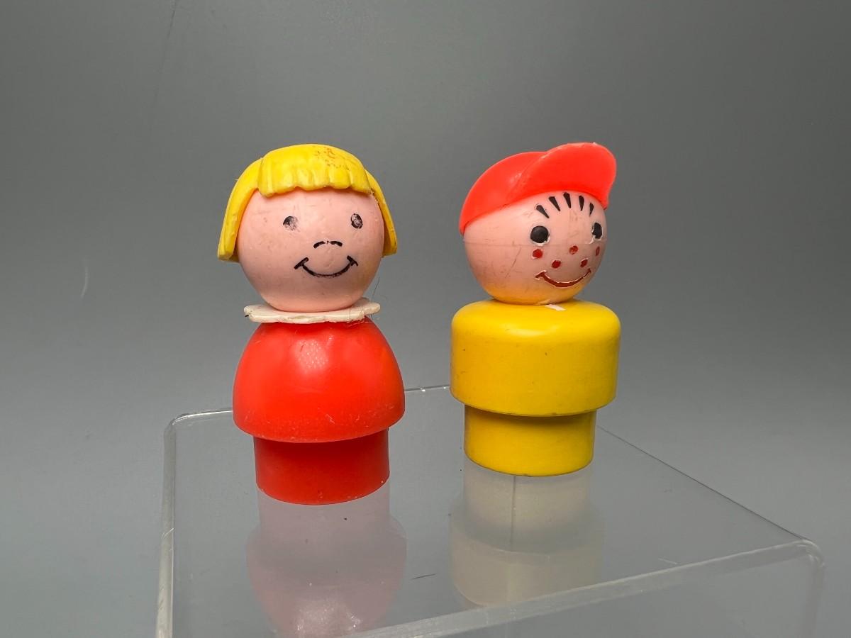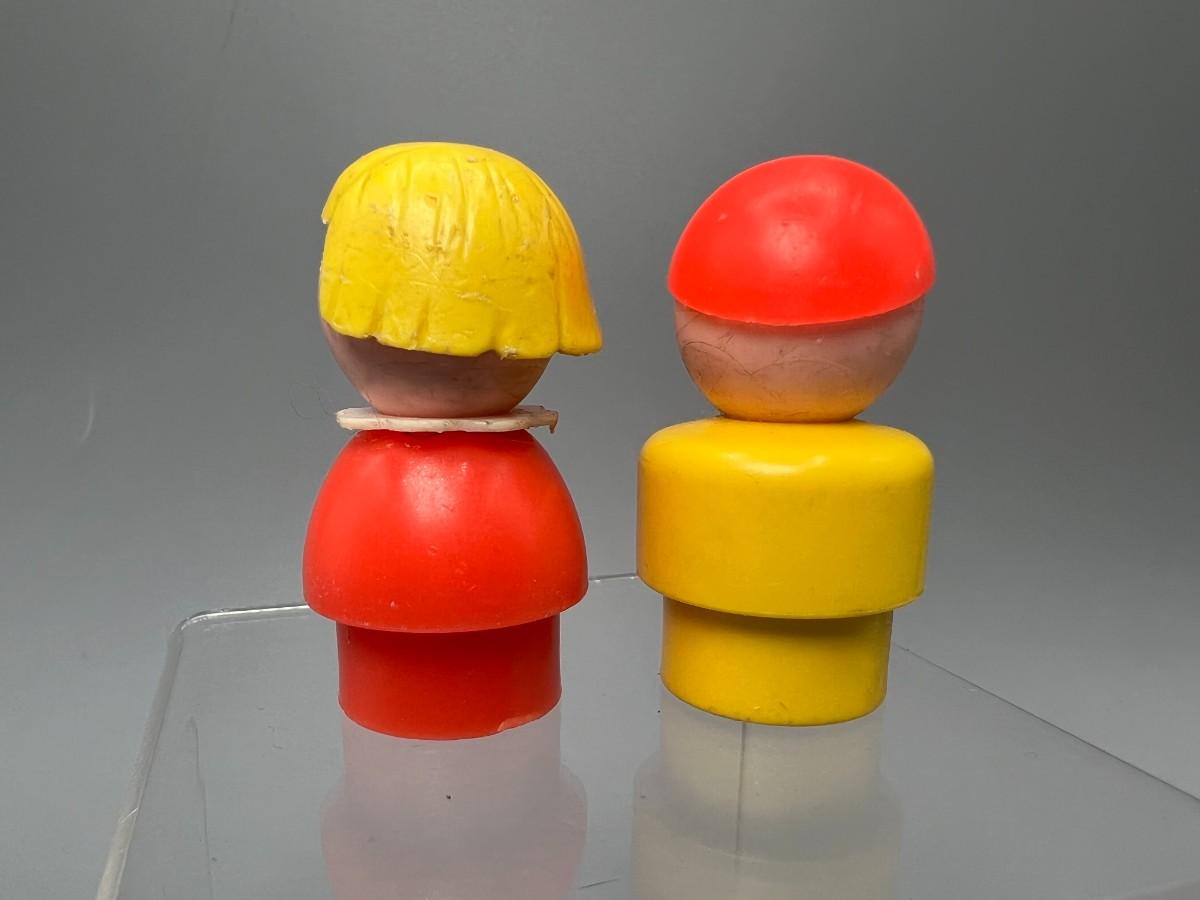 Vintage Fisher Price Little People Play Family "A" Frame play set #990. Made in 1974-76. Good played with vintage condition. Included in the set is the A Frame House, Yellow Bunk Beds (2 sets), 2 yellow lounge chairs, 2 yellow captain chairs, yellow BBQ with sticker attached, white picnic table with sticker attached, 1 picnic table bench (1 missing), white ladder, red and white car, green dad with black heat-stamped hair, blue mom with fancy eyes, and a blonde ponytail, yellow boy smiling, with freckles, eyebrows, and a red baseball cap facing forward, red girl with a blonde bob with bangs, black dog with a red collar. Originally all the people were wood with plastic bodies, the girl, boy, and dog are identical to originals but seem to be plastic body. The foam for bunkbeds has disintegrated, which is common with the foam that was used. Decals are in good, aged condition, none missing just light wear.