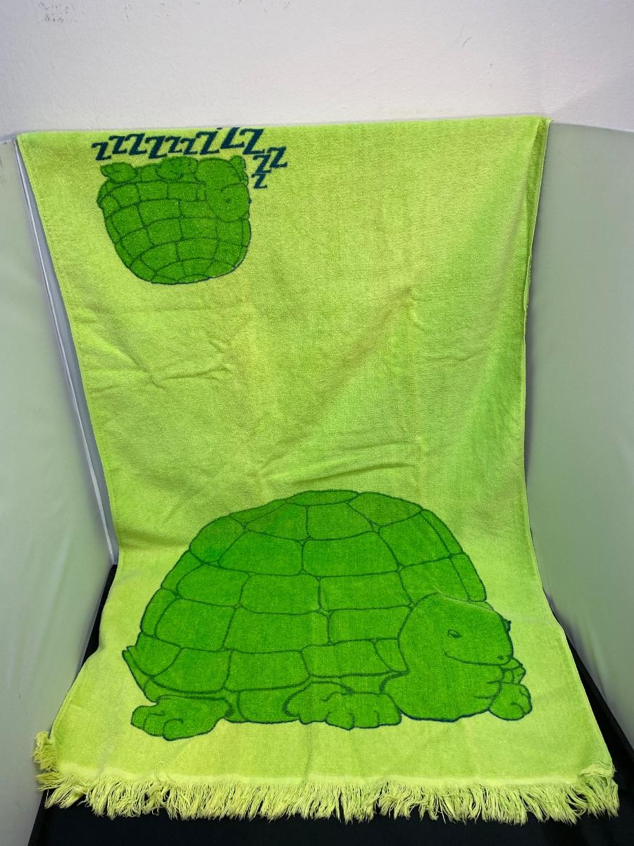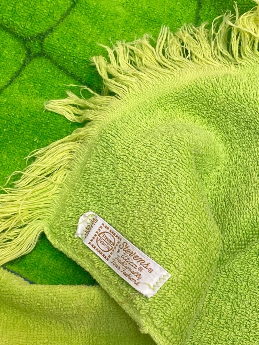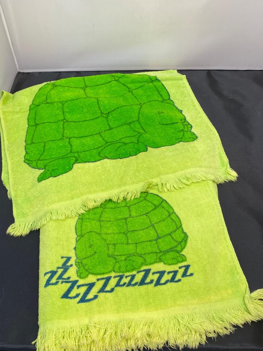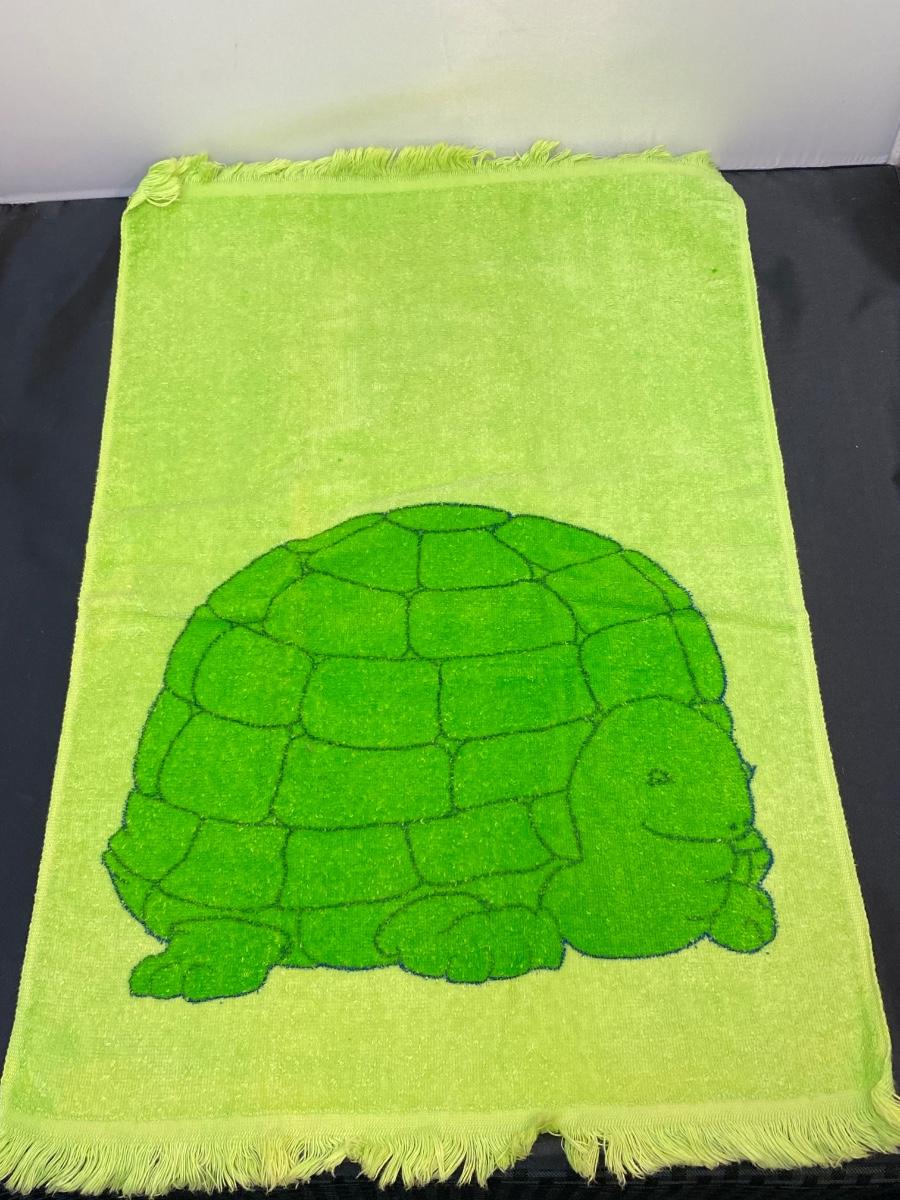 Vintage green turtle children's bath and hand towel set. Made by Stevens Fabrics. In good vintage condition, no spots, stains, or holes. Image design is in good condition, very little fade.