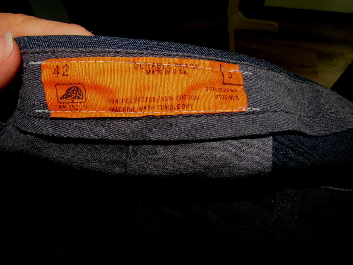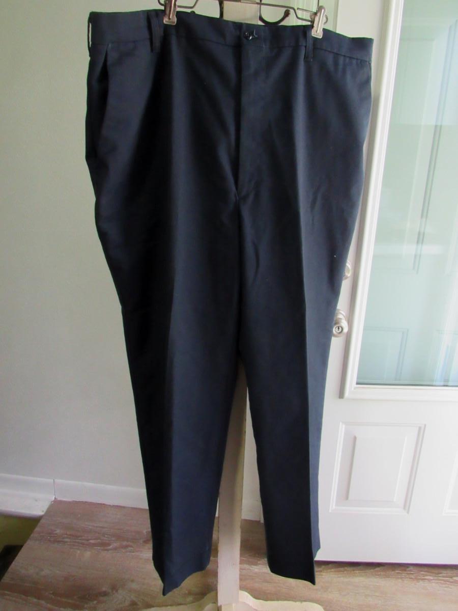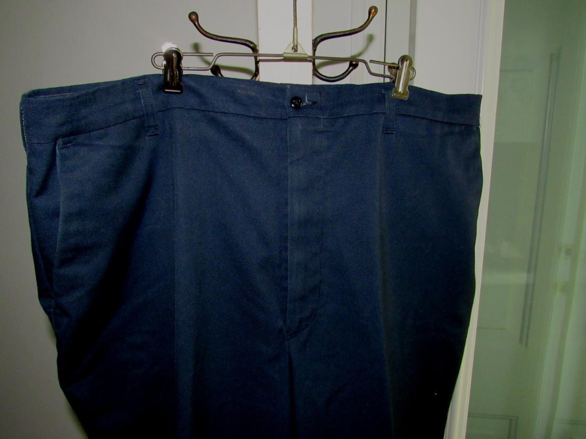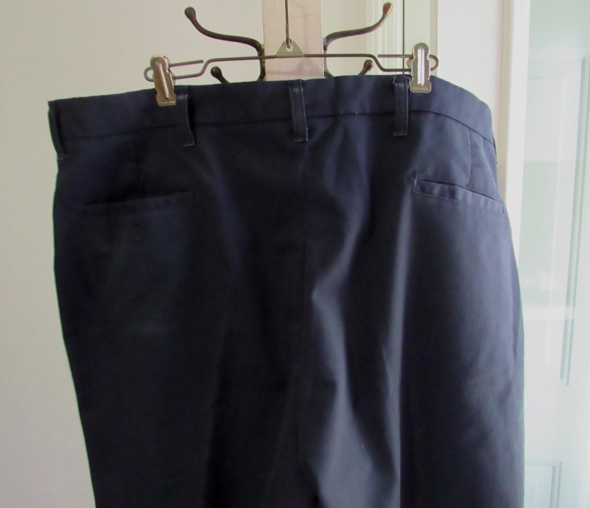 Poly/cotton blend. Size 42, made in USA. Nice weight, long. Zipper good, all belt loops. Good hem. Back pocket button missing. Shipping is available at actual shipping cost plus $5.00 handling fee per box for supplies/labor. See our terms for details. All sales are final. Condition notes may not be all inclusive, we may miss some issues as most vintage items are not in mint condition and have some degree of wear, paint loss, etc, but we always try to note obvious damage.