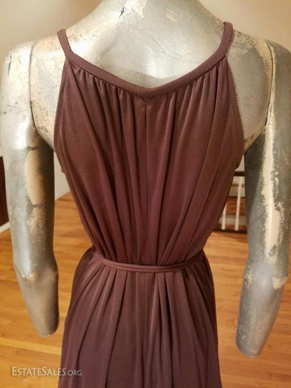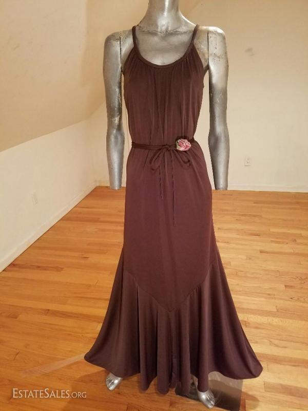 Beautiful Hobo Chic 1970's Ursula of Switzerland maxi gown in cocoa brown coloration and a flower piped belt. Bottom hem fluid petal. In very good vintage condition very collectible.