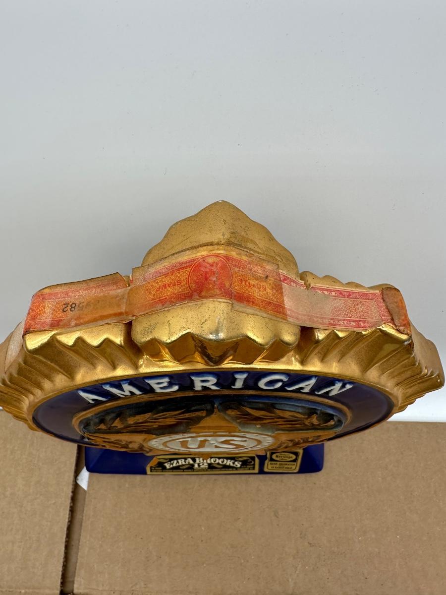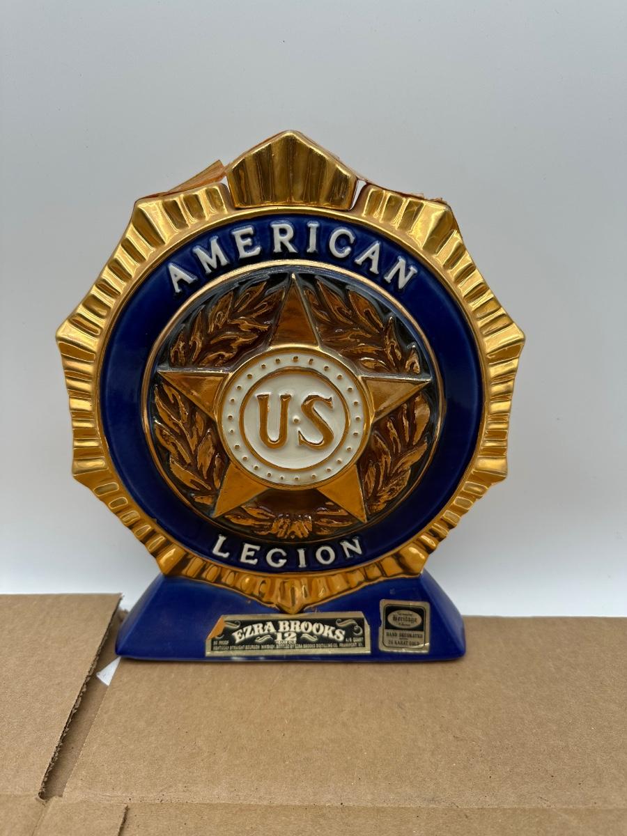 Vintage Ezra Brooks American Legion commemorative whiskey decanter produced for the 53rd National Convention, Houston, Texas (1971). Made by Heritage China, hand decorated with 24 karat gold accents. Front features the American Legion emblem in deep cobalt blue and gold; reverse displays a raised Texas map with convention details.