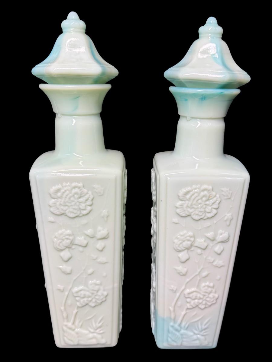 Two green slag glass bottles. No obvious chips or cracks. Measurement: 12”H (each). Pre-auction estimate: $25-$50. [KD]