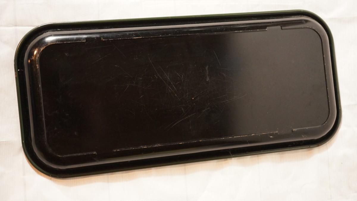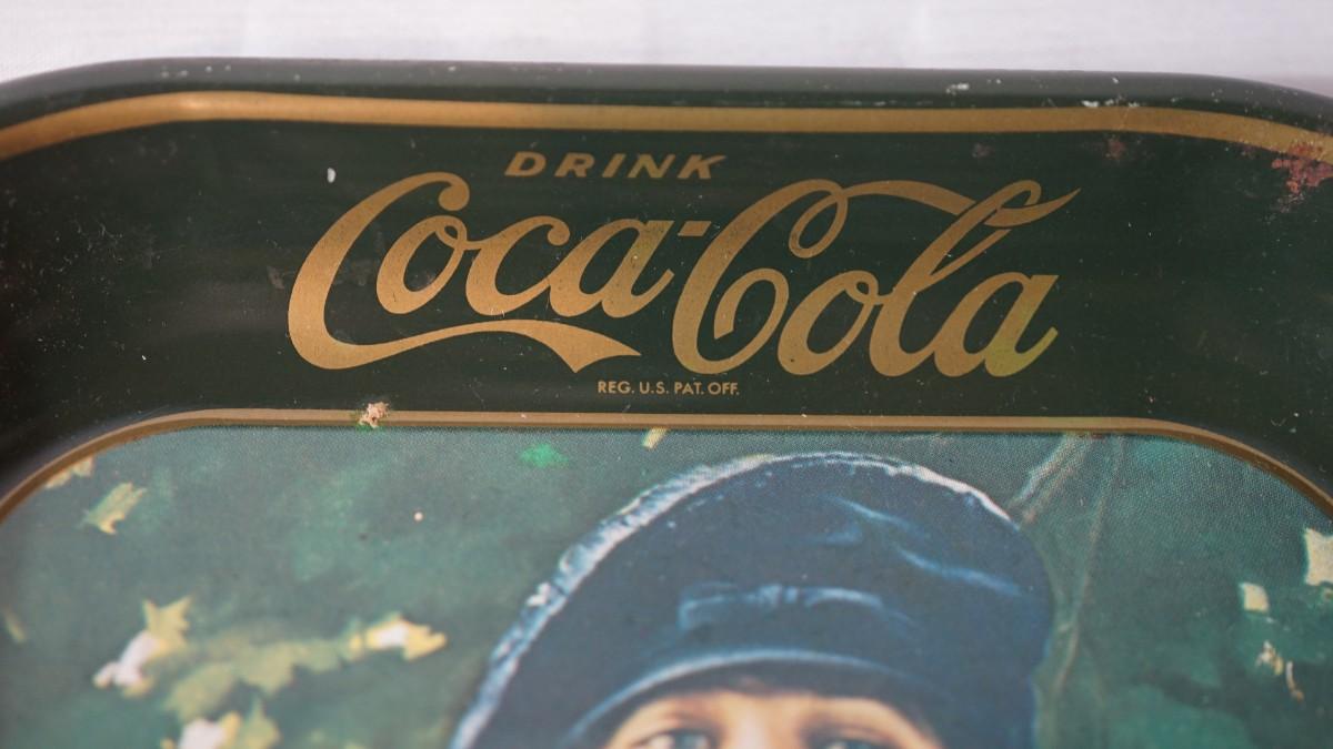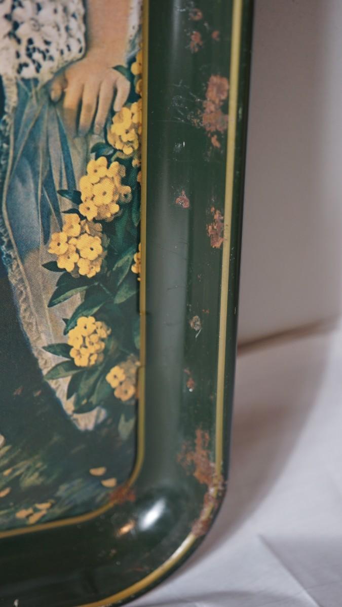 areas of rust around the lower right rim of the tray and small area on the top left. Slight wear on the rim and on the back of the tray.