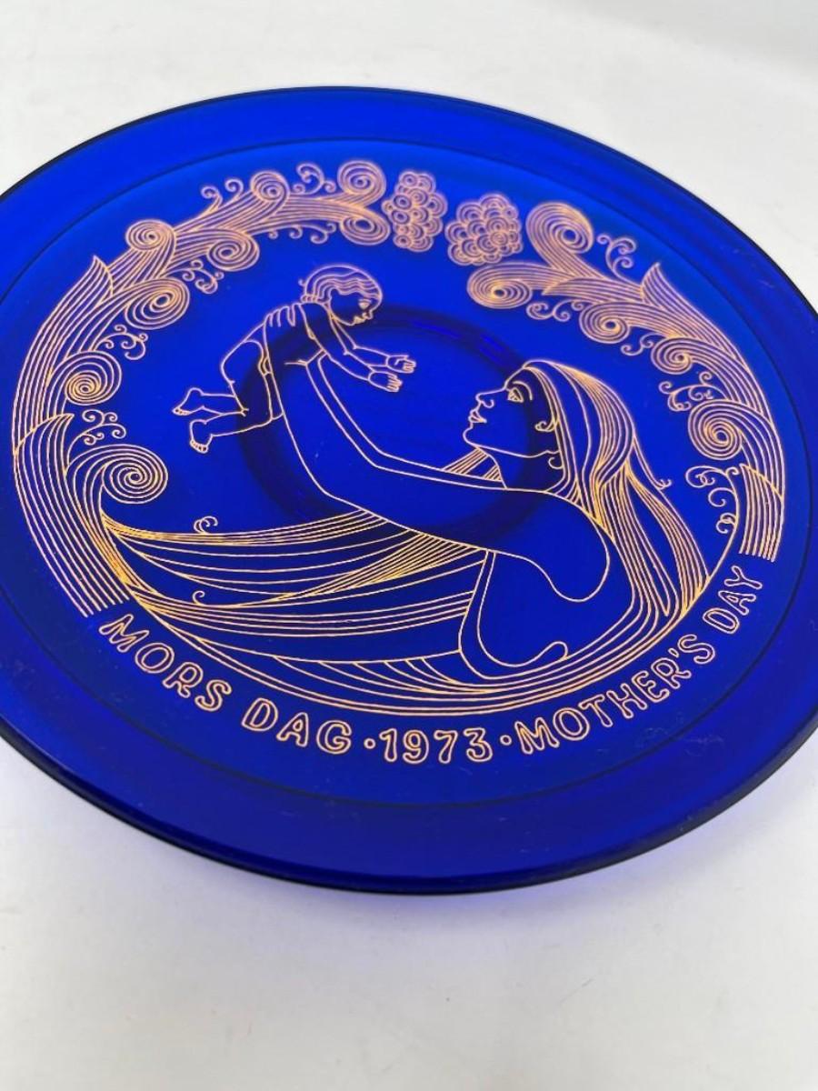 Vintage, limited edition, 1973, cobalt blue glass Mother's Day plate by Orrefors, Sweden. Plate is in excellent condition and comes with original box, 8"