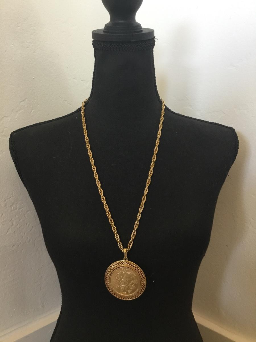 Vintage 1975 coin pendant necklace chain gold tone
